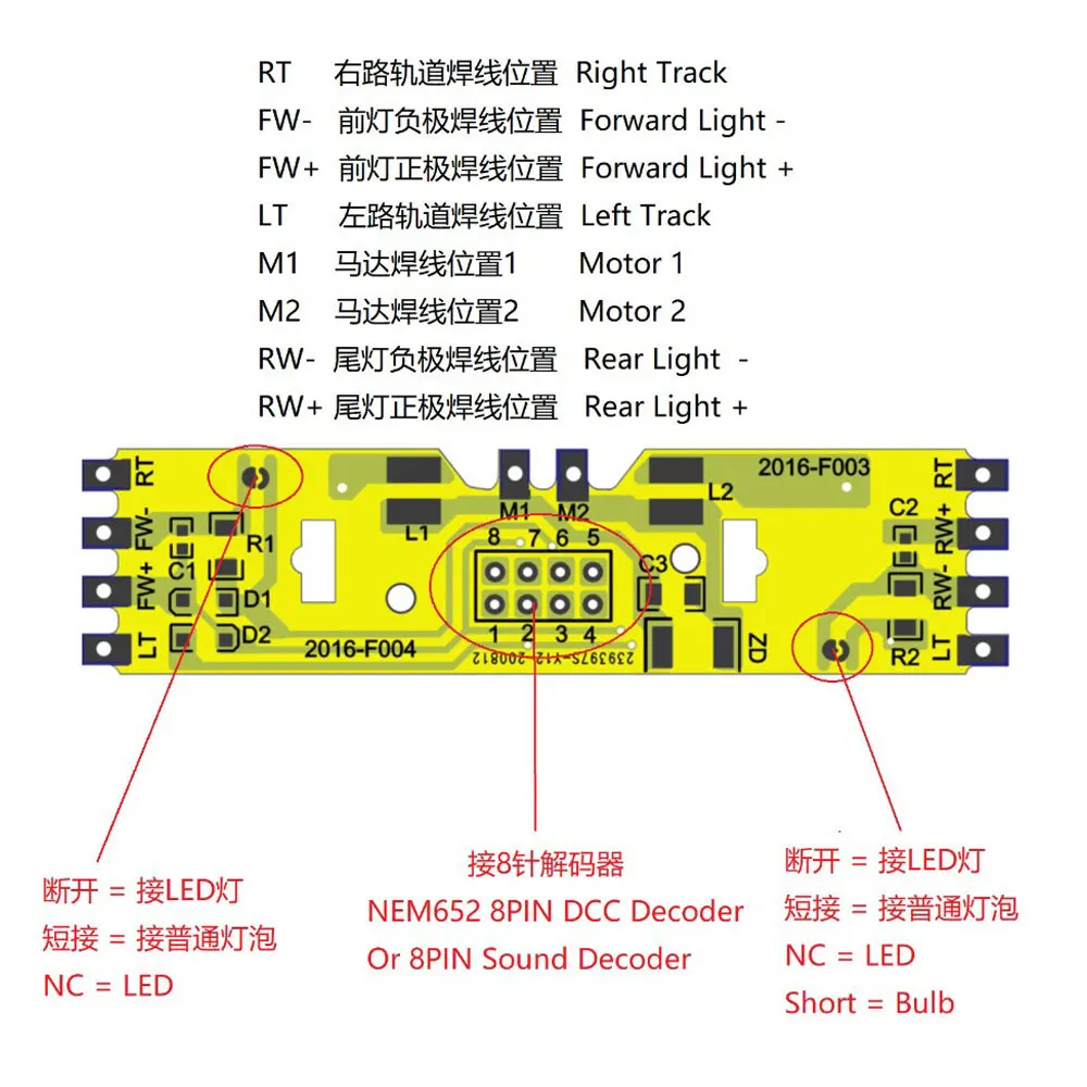 - Equipped with multiple metallic solder pads labeled “L,” “R,” “T,” “+,” and “−” for straightforward wiring to motor, lighting, and accessories, enhancing your train’s functionality and realism.