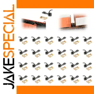 Step into the world of detailed model railroading with this set of 12 pairs of HO scale metal couplers by Evemodel. Designed specifically for 1:87 scale models, these couplers feature a sleek, metallic finish with a dark gunmetal or silver hue, enhancing the realistic appearance of your train layout. Each durable metal coupler showcases a compact rectangular base with a smoothly curved hook for seamless connection between cars. The included golden-colored washers provide secure mounting, giving your train cars both stability and a refined look. Crafted with precision, these couplers combine industrial aesthetics with functional elegance, making your model railway setup more authentic and visually appealing.