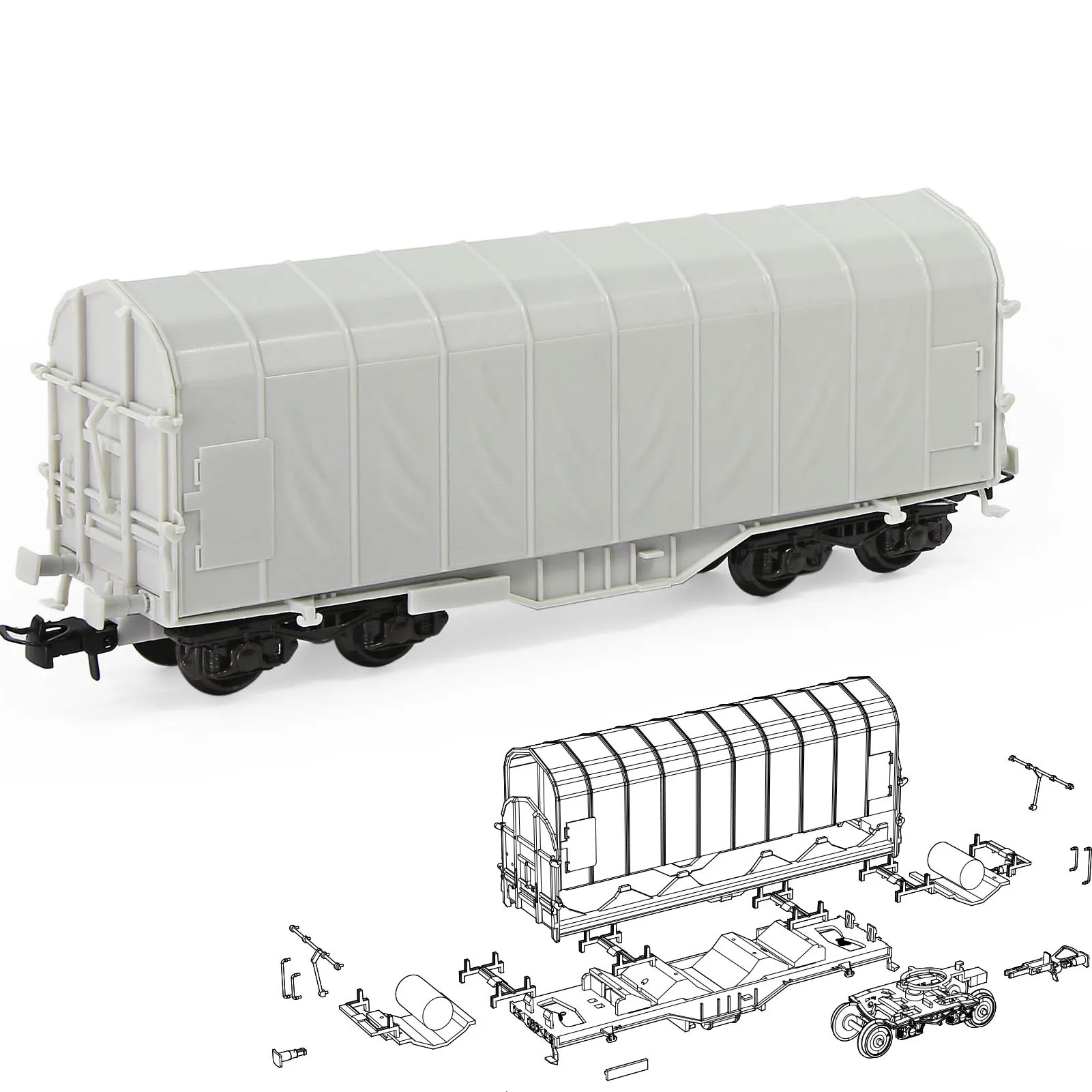 Immerse yourself in the craftsmanship of this meticulously designed HO scale 1:87 covered coil wagon. Made from high-quality plastic and metal, this unassembled model offers a perfect blend of durability and detailed realism. Its smooth, white exterior is accented with subtle panel line engravings, curved roof, and realistic latches on the side panels, closely mimicking actual freight cars. The black-painted wheelsets and undercarriage add authenticity, while the overall elongated rectangular shape enhances the model’s realistic appearance. Designed for customization, it allows you to print your own logo, giving you a personal touch to your railway scene. It promises to add depth and authenticity to your model railway setup, inviting you to bring your transportation scenes to life.