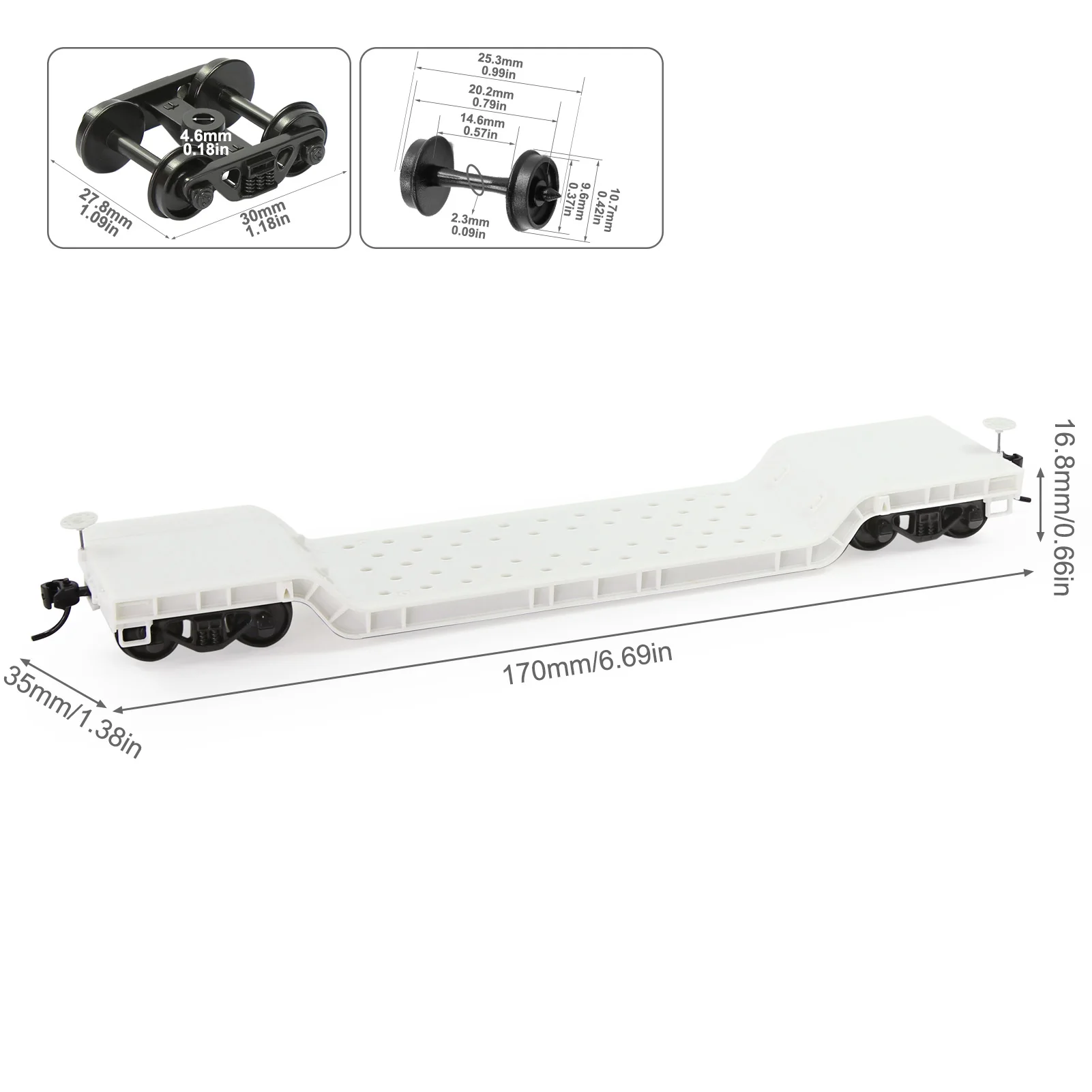 Experience the ideal addition to your rail layout with this highly detailed HO scale center-depressed flatcar. Crafted from durable ABS plastic, this model features a sleek, minimalist design finished in pristine white, highlighting its realistic construction and precise detailing. The flatcar’s slightly lowered center section offers an authentic, functional aesthetic, perfect for customizing with cargo or load accessories. Its surface showcases evenly spaced small holes, ready for attaching additional features or cargo. The model includes modular parts for easy assembly, allowing you to create a realistic and personalized train setup. Whether you choose the basic set or the one with a 20ft blank container, this flatcar enhances your display’s authenticity and scale accuracy.