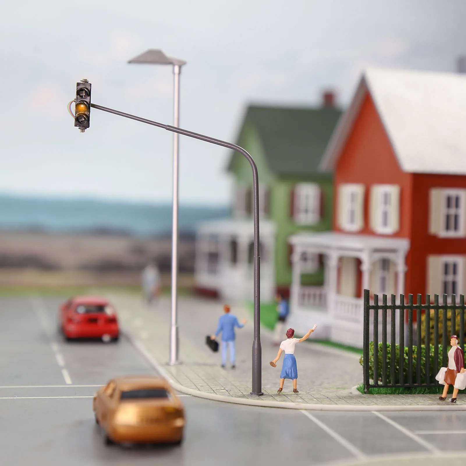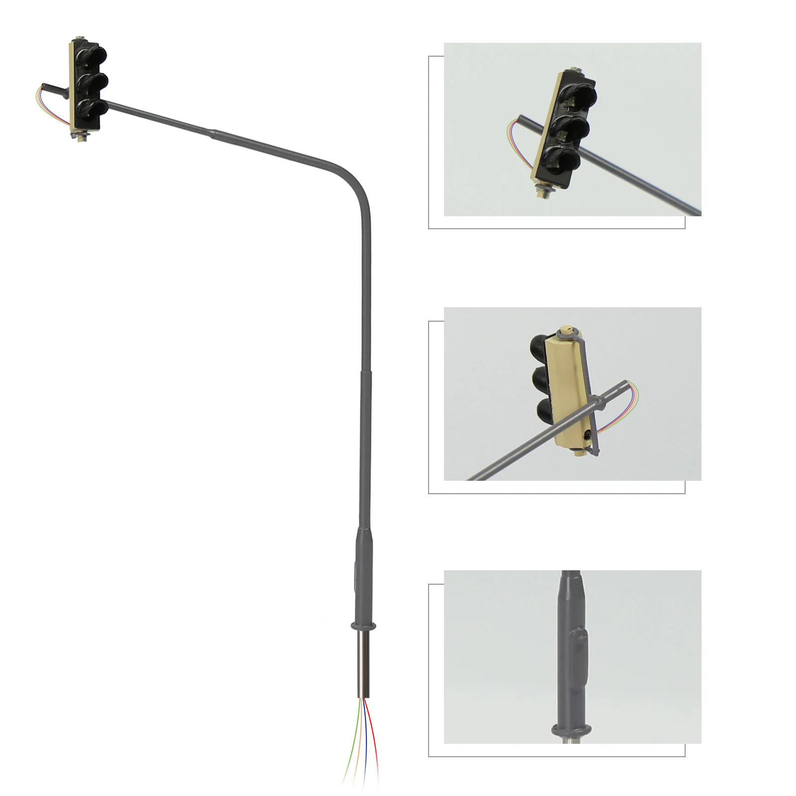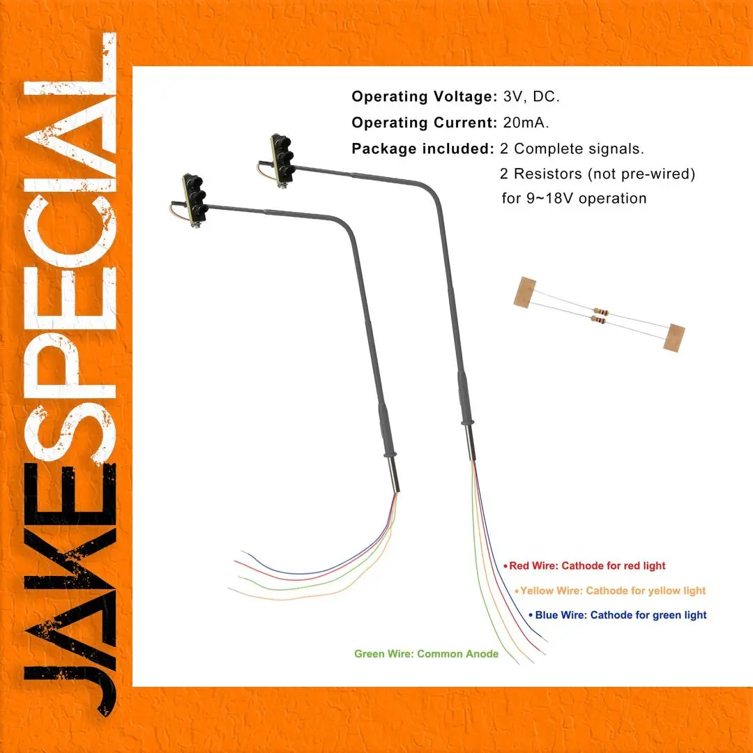 Enhance your HO scale railway scene with these realistic hanging traffic lights, modeled at a 1:87 scale. Crafted from durable metal, each set includes two complete signals with detailed signal head designs and authentic paint finishes in vibrant red, yellow, and green. Designed for compatibility with 3V DC power sources and operating at 20mA, these signals feature slender, tapered gray poles with curved wires for a lifelike appearance. Also included are two resistors rated for 9โ€“16V operation (not pre-wired). Perfect for adding an authentic and high-detail touch to your model railway layout, these signals combine precision, realism, and durability.