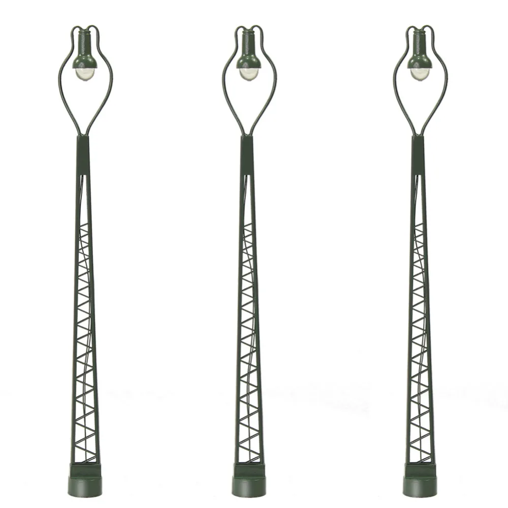 Step into the world of detailed railway scenery with this set of three miniature street lamps, each standing approximately 12.8 cm tall. Crafted with a vintage-inspired, tapered metal structure finished in dark green, these lamps feature an intricate lattice design that enhances realism and industrial charm. Equipped with warm white LEDs, they emit a cozy glow perfect for creating inviting city or town scenes. Designed to operate at 3V AC/DC power supplies, each LED requires a precise 20mA current. Three included resistors allow safe operation at 9-18V, preventing damage when connected to higher voltages. These lamps add a sophisticated touch of authenticity to any HO scale layout, bringing your miniature scene to life with subtle lighting detail. They are ideal for adult enthusiasts seeking realistic, functional cityscape accents.