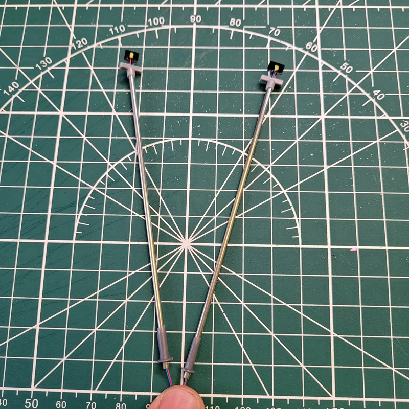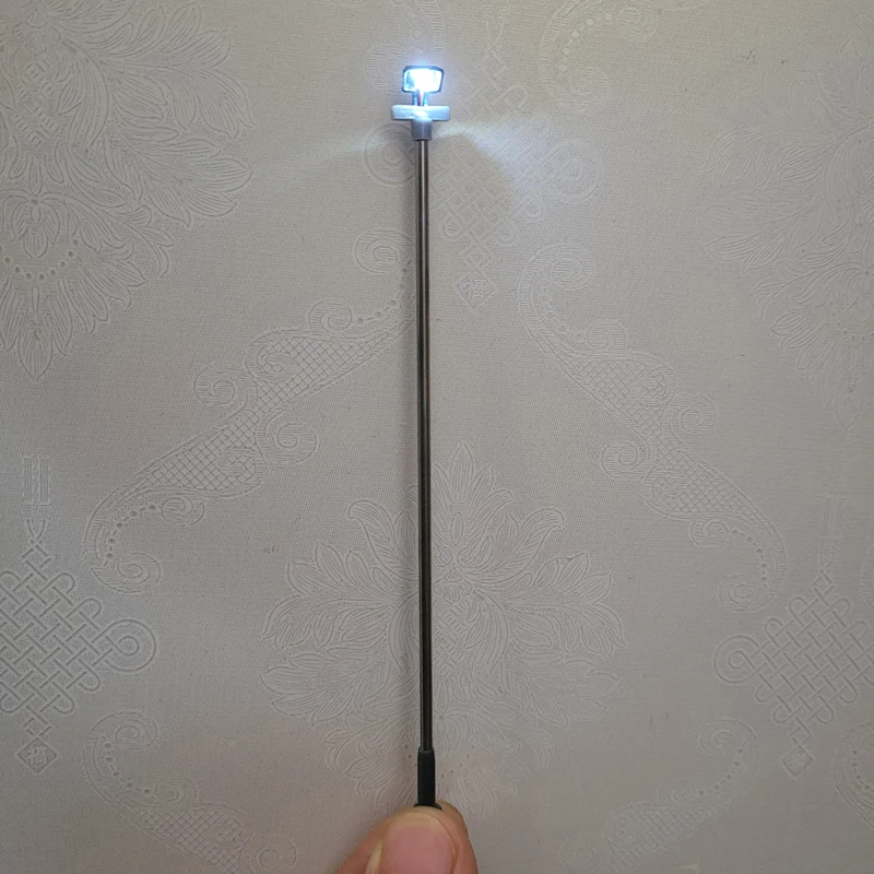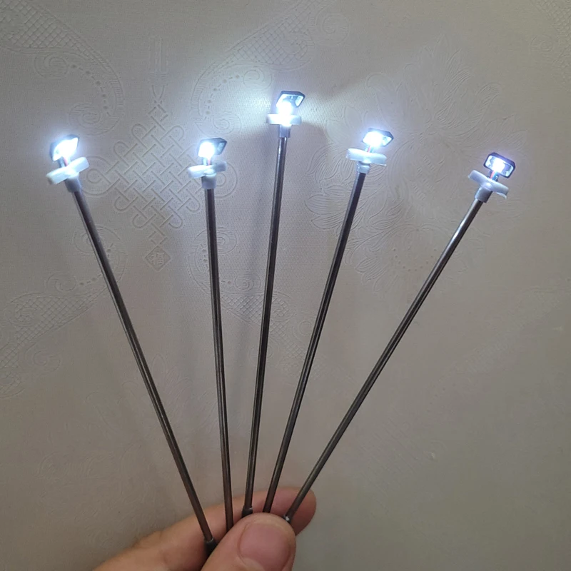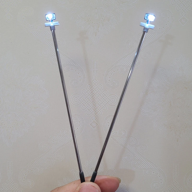 Enhance your miniature scenery with this set of two meticulously crafted HO scale lighting towers. Standing approximately 12 centimeters tall, each tower features sleek, straight metallic poles with a shiny finish, topped with black rectangular light fixtures accented by colorful markings that mimic real LED or bulb components. Made from durable stainless steel and plastic, they offer a realistic appearance perfect for model landscapes, train layouts, or dioramas. The towers feature red and blue flexible wires for electrical connection, supporting operation on DC 3V power supplies. This set not only adds authenticity but also enhances your scenery's ambiance, making your model scene come to life with realistic lighting effects and fine detail craftsmanship.
