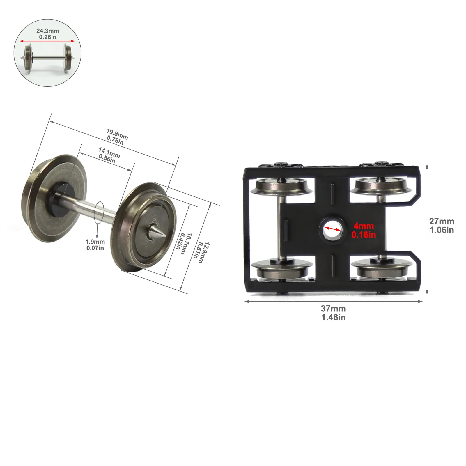Enhance your railway layout with this meticulously crafted set of four HO scale bogies, each designed for 1:87 model trains. Crafted from durable plastic with sleek black frames, these bogies feature high rim psyllium wheels, adding realistic detail to your setup. The copper wheels are nickel-plated, giving a shiny, authentic appearance suitable for serious collectors and hobbyists. Each bogie includes two 36-inch metal DC wheelsets, perfect for smooth and reliable operation without magnetic interference. With precise dimensions and reinforced structural design, these bogies seamlessly fit compatible HO scale trains and rolling stock, instantly elevating your model railway's realism. Create a detailed and immersive scene with these expertly designed components.