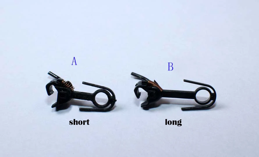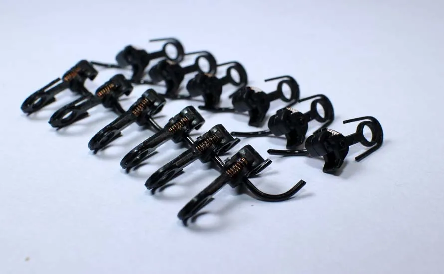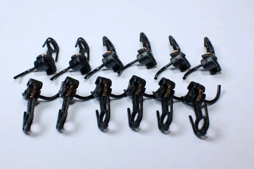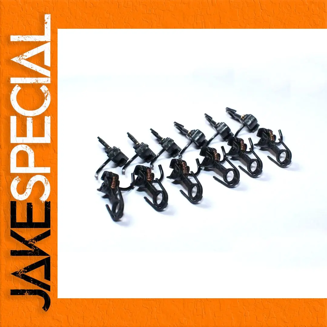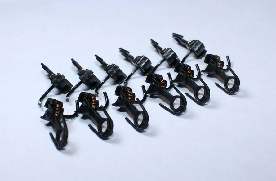 Enhance your model train setup with this set of 12 train couplers, designed specifically for 1:87 (HO) scale models. Available in two variations: Section A with dimensions of 5.2 mm (width) and 17.3 mm (length), and Section B featuring a middle axis length of 8.2 mm and a total length of 20 mm. Crafted from durable plastic, these couplers exhibit a sleek black finish and include a practical hook mechanism with a spring element for secure attachment and easy operation. Experience the realism and functionality these couplers bring to your model railroading projects.