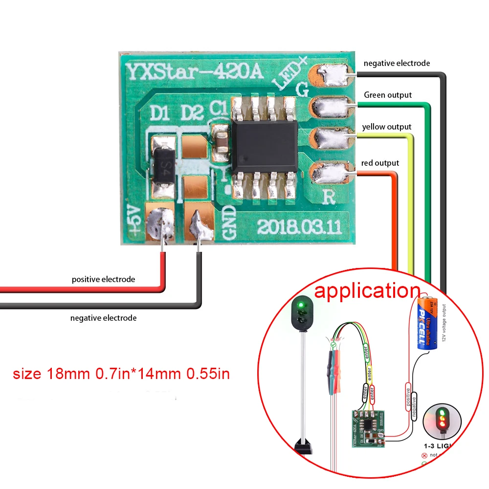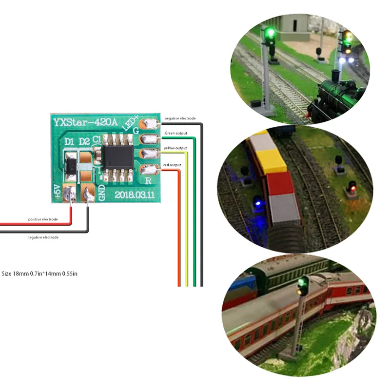 Enhance your HO scale (1:87) railway and Diorama models with this set of three compact traffic light circuit boards, measuring 19.1 x 18.5 mm. Operating at 5-6V with a current of 60mA and power of 0.36W, each features a micro-circuit for realistic light effects, crafted from durable plastic and steel pipe for an authentic look. The boards include black wires for positive connections and other wires for negative, making installation seamless. Perfect for construction sand table models and DIY projects, these circuits animate traffic signals providing dynamic, lifelike details to your train layouts and architectural displays.
