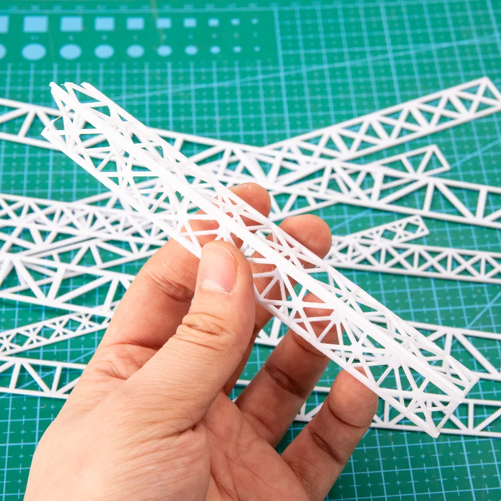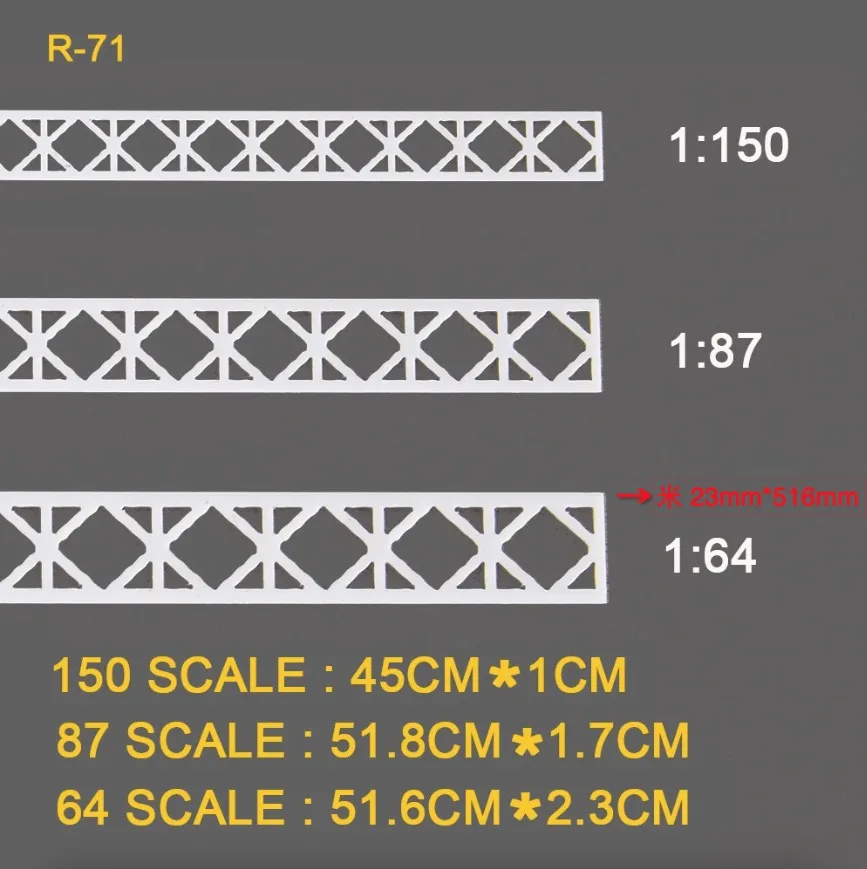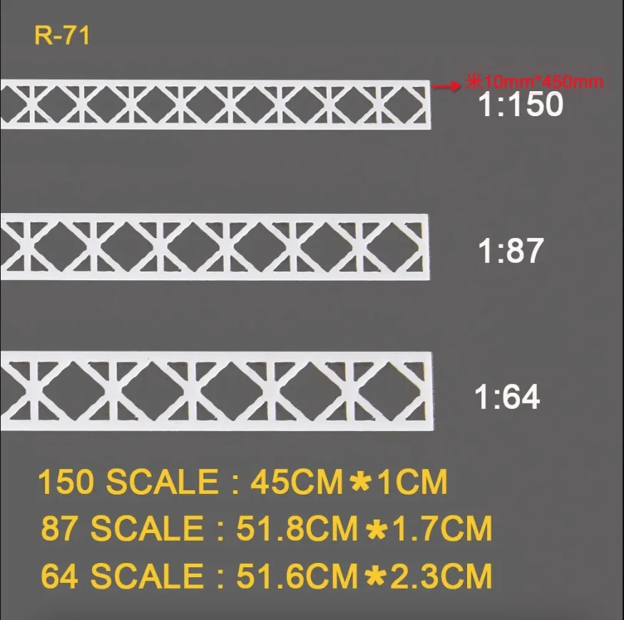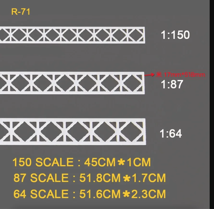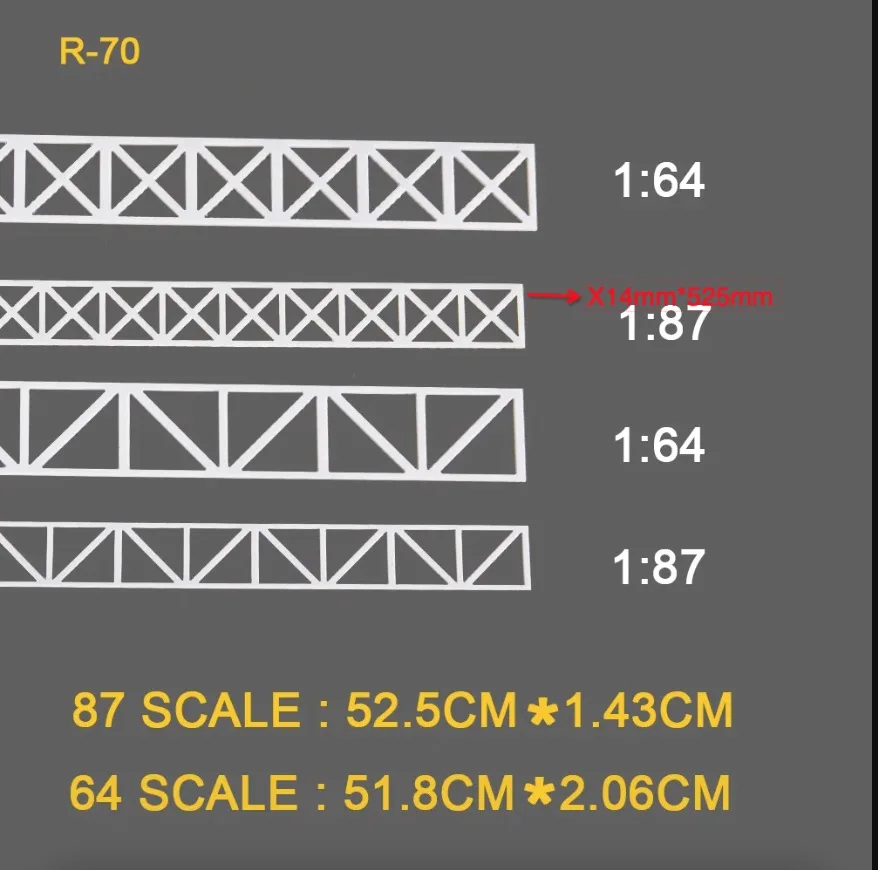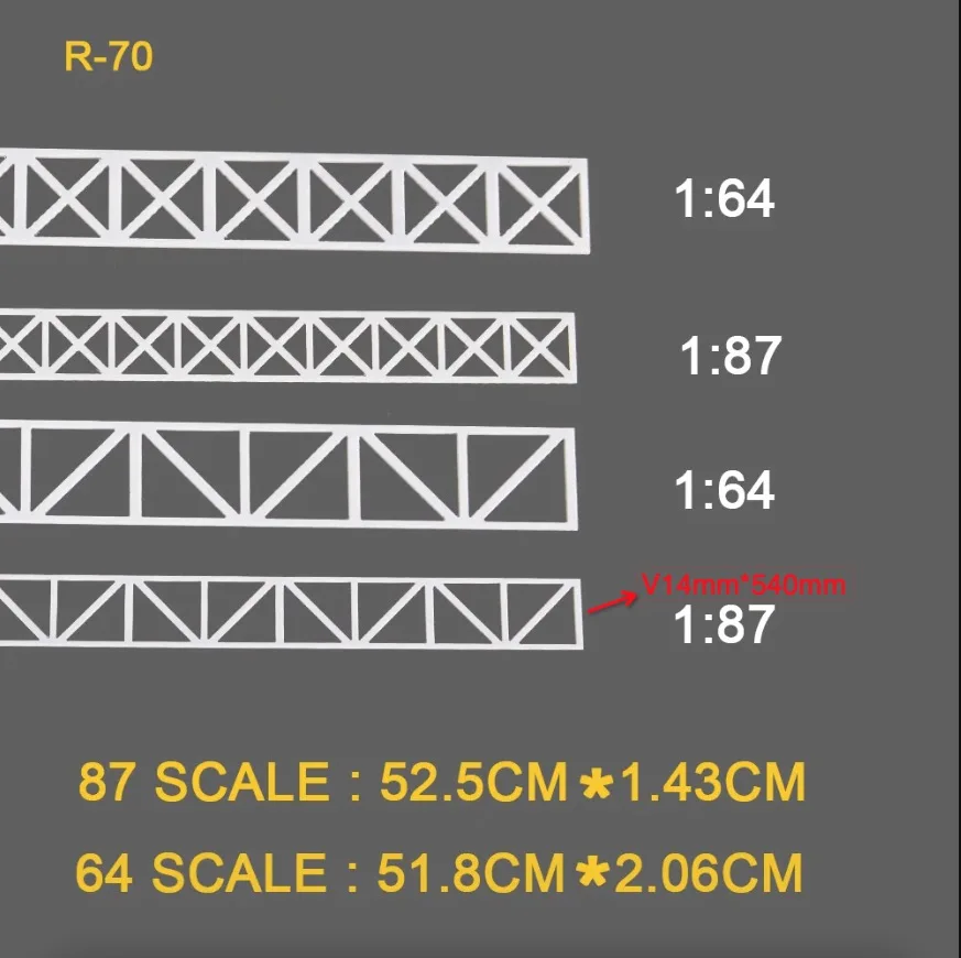 This versatile set of five HO scale model trusses is expertly designed to enhance your railway landscapes. Crafted from high-quality ABS plastic in a sleek white hue, each truss showcases distinct V-shaped and X-shaped designs. With detailed diagonal and cross bracing, these models add realism and depth to your setups. Each scale corresponds precisely to 1:64, 1:87, and 1:150, ensuring that they fit seamlessly into your model train environment. Whether you're building a highway scene or enhancing sand table displays, these trusses are perfect for all your creative projects, allowing you to customize them easily to suit your specific themes.