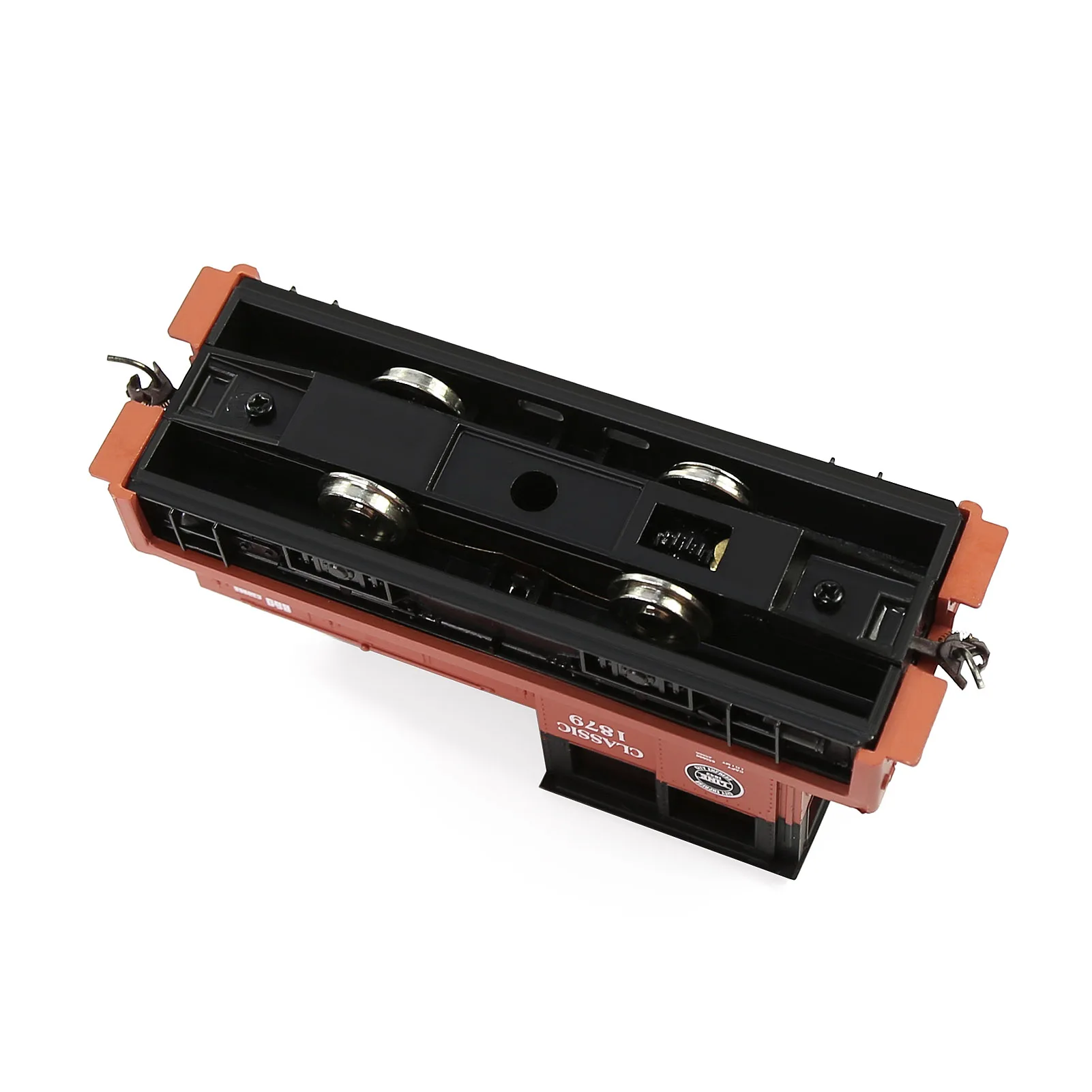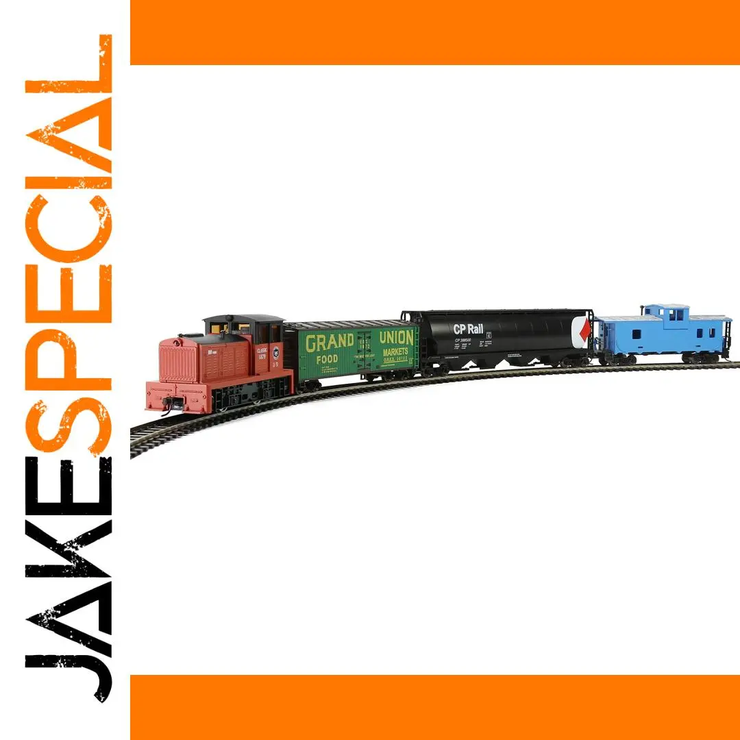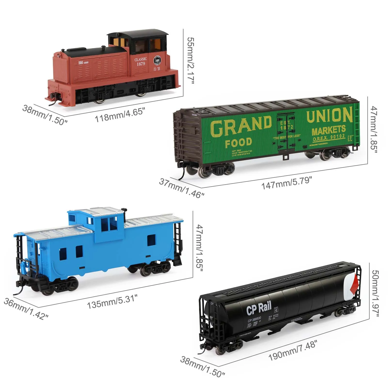 Enjoy bringing your model train layout to life with this detailed HO scale set from Evemodel. Featuring a vintage-inspired locomotive with a striking red and black finish, it exudes classic industrial charm. The set includes three realistic wagons: a vibrant green boxcar marked “Grand Union Markets,” a sleek black cylindrical tanker with piping and hazard markings, and a bright blue wide-vision caboose with large windows and a small cupola. Crafted from durable plastic and metal, all components showcase finely painted textures, small intricate parts, and detailed undercarriage features. Designed to operate smoothly on a 12V DC power supply, this set offers both aesthetic appeal and functional realism, making it perfect for adult collectors or railway enthusiasts eager to create a vibrant rail network.