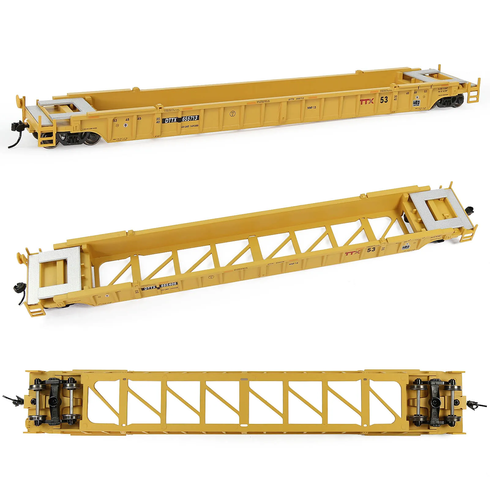Imagine adding this realistic well car set to your model train collection, bringing dynamic intermodal freight scenes to life. Crafted with meticulous detail, this HO scale set features a vibrant yellow chassis paired with sleek black wheels and precision metal axles with needlepoint bearings, ensuring smooth operation on your layout. The six containers in assorted colors—blue, orange, white, red, and green—are intricately detailed with authentic logos, panel lines, and branding, significantly enhancing realism. Each 256mm long well car is designed to transport 53-foot shipping containers, matching HO scale proportions perfectly. This durable set, made from high-quality plastic and metal, is perfect for creating vivid, lifelike freight scenes that captivate viewers and add authenticity to your model railway.