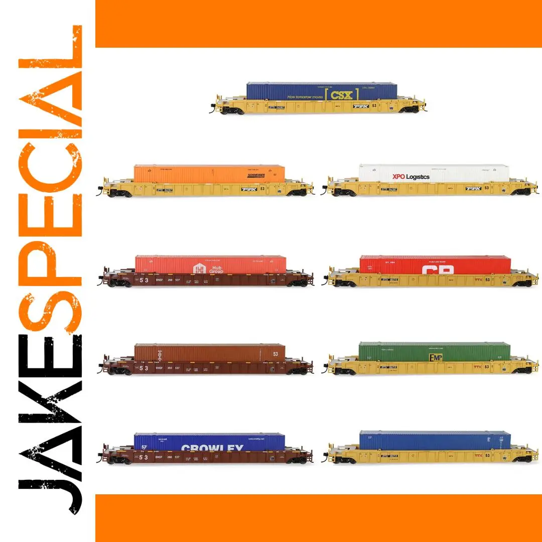 - The set includes one well car with a detailed 53-foot container, with state-of-the-art logos and panel lines painted in vibrant colors such as blue, orange, white, red, and green.