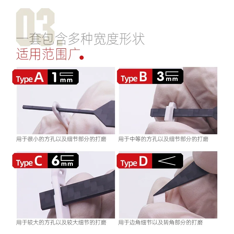Experience precision with this sleek, professional-grade sandpaper holder set designed for detailed model polishing. Crafted from durable carbon fiber, each component offers a lightweight yet sturdy feel, perfect for intricate tasks. The versatile 4-in-1 irregular polishing plate allows seamless switching between grit sizes, providing excellent control and accuracy for finishing surfaces. With a thickness of just 1mm, it ensures fine detail work without obstructing your view. Whether you’re removing scratches, refining textures, or achieving a smooth polish, this tool elevates your craftsmanship. Its modern white design accented with bold red branding makes it both stylish and functional. This set helps you attain high-quality details, making your modeling projects look flawless and professional every time.