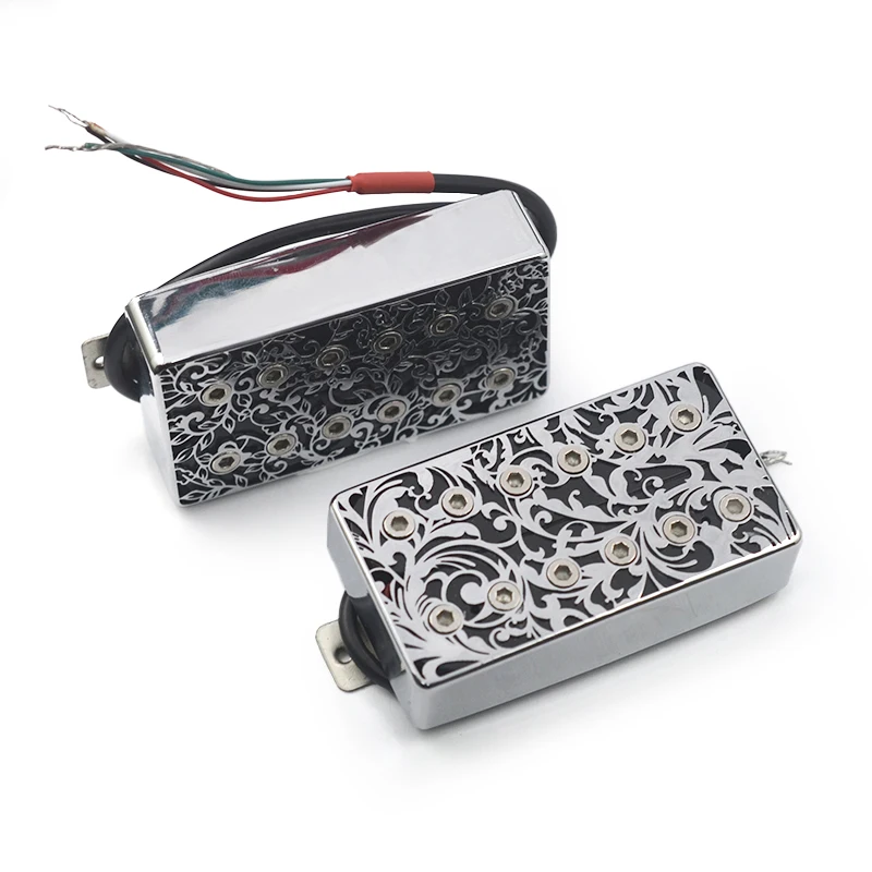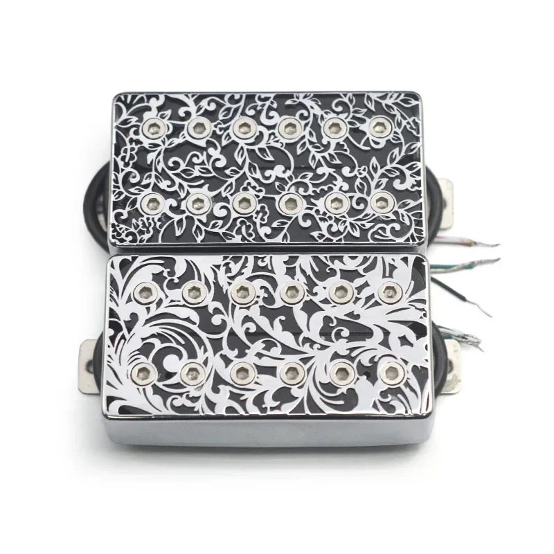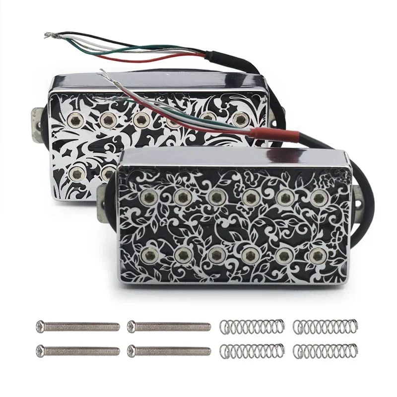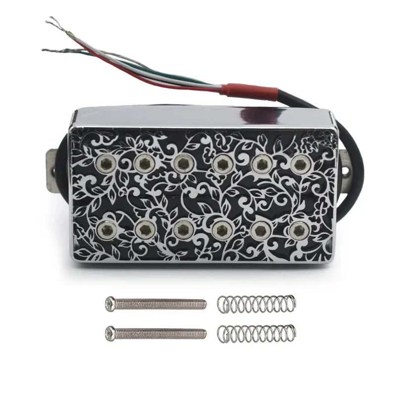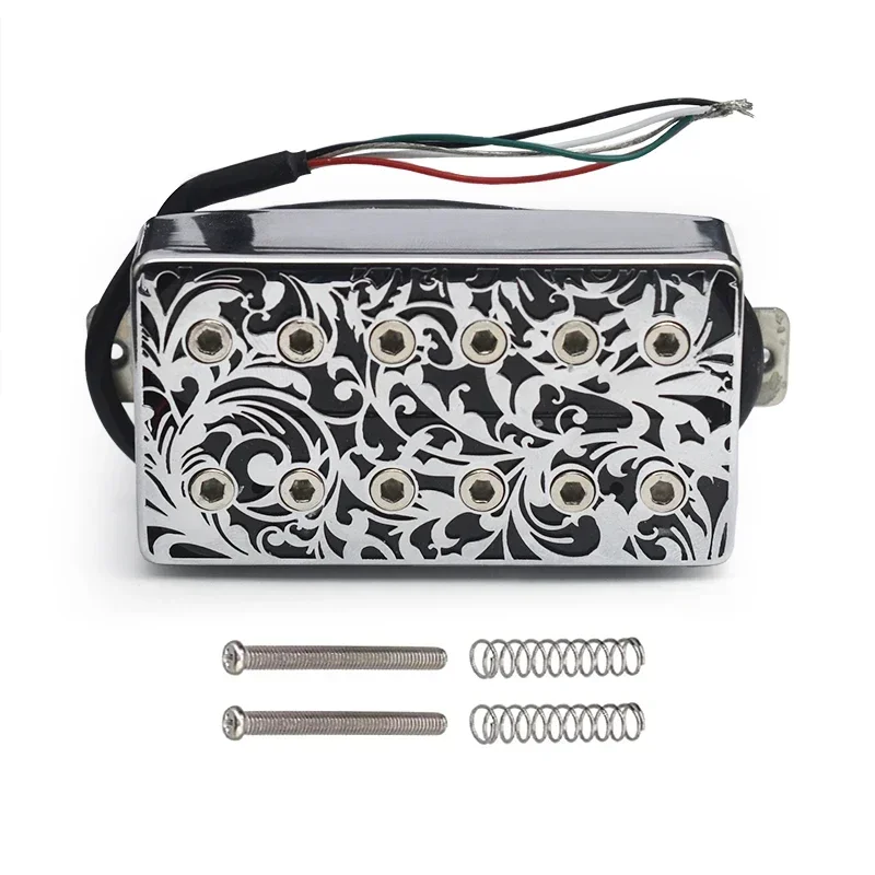 Immerse yourself in the rich, vintage-inspired tone of this high-quality, double-coil humbucker guitar pickup featuring a stunning hollow brass cover. Designed specifically for LP-style electric guitars, this pickup combines classic aesthetic details with modern performance. The chrome-plated metal cover, adorned with intricate swirling vine and leaf motifs, adds an ornate, timeless appeal to your instrument. With durable construction and a precisely crafted white copper base plate, it offers excellent sound clarity and resistance to feedback. Whether you're replacing your old pickup or upgrading your guitar’s sound, this piece provides warm, punchy tones with slight output enhancement. Its versatility makes it suitable for various positions, enhancing your overall playing experience.