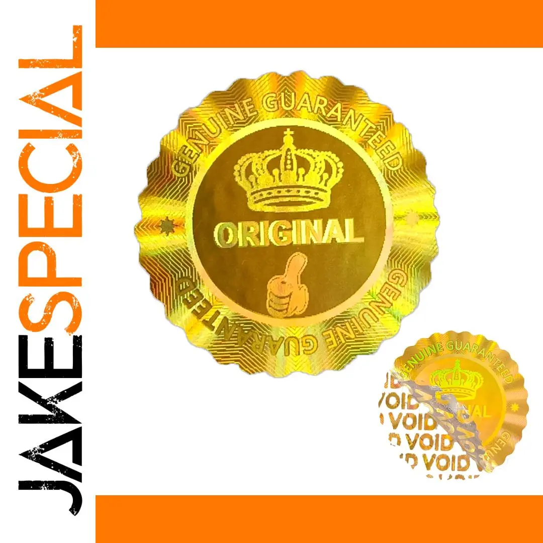 - Technical specifications include: 2.5 cm diameter, holographic finish, plastic material, lace edges, crown motif, “Original” and “Genuine Guaranteed” text, durable tamper-evident design.