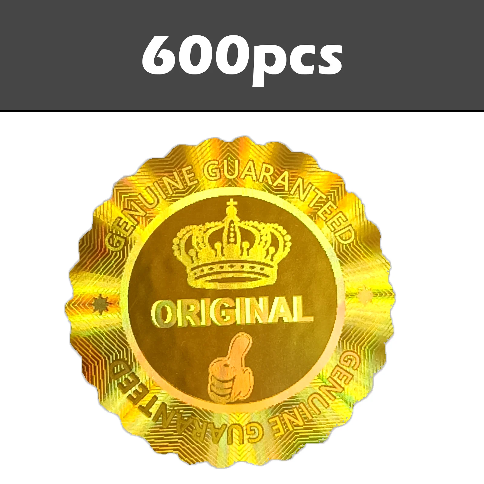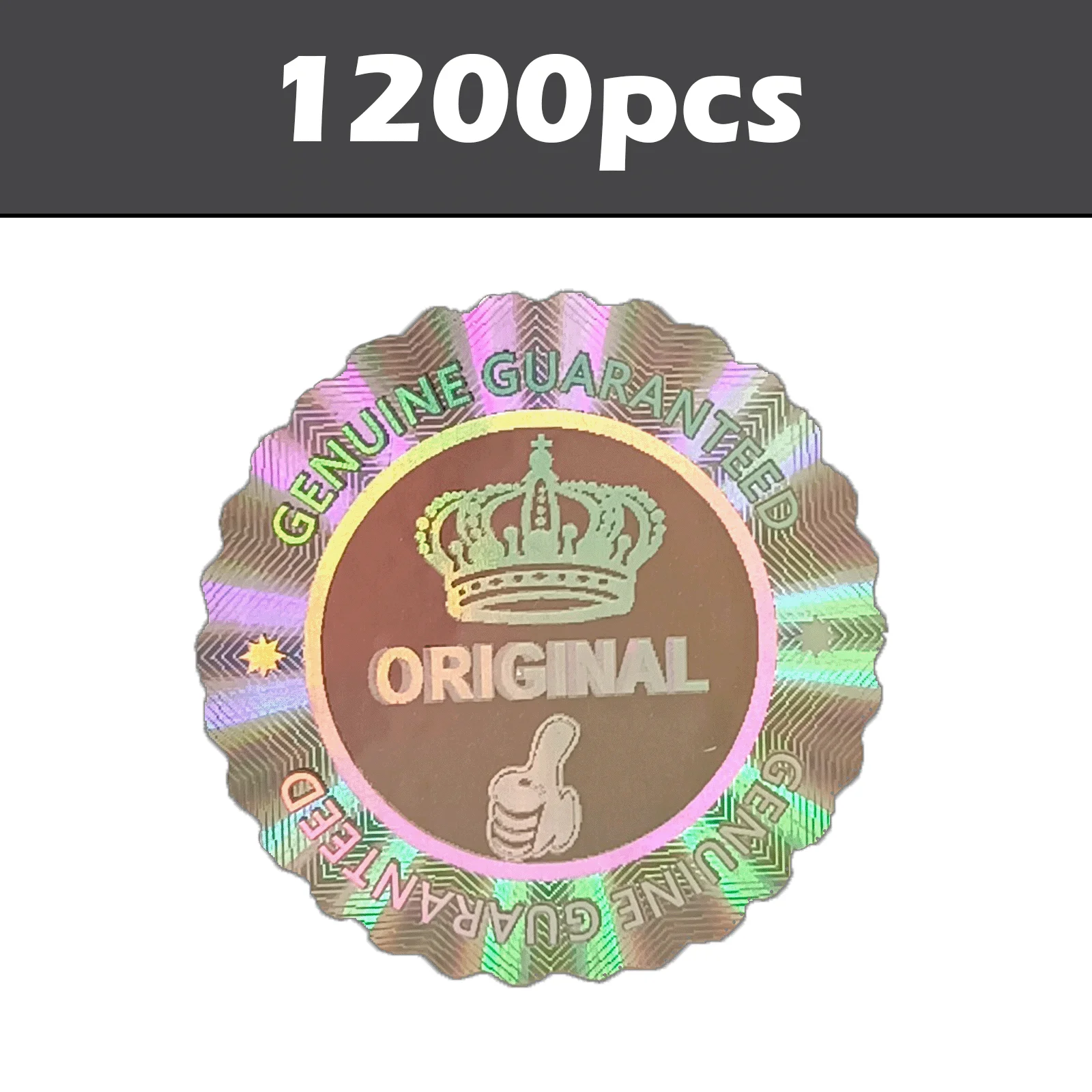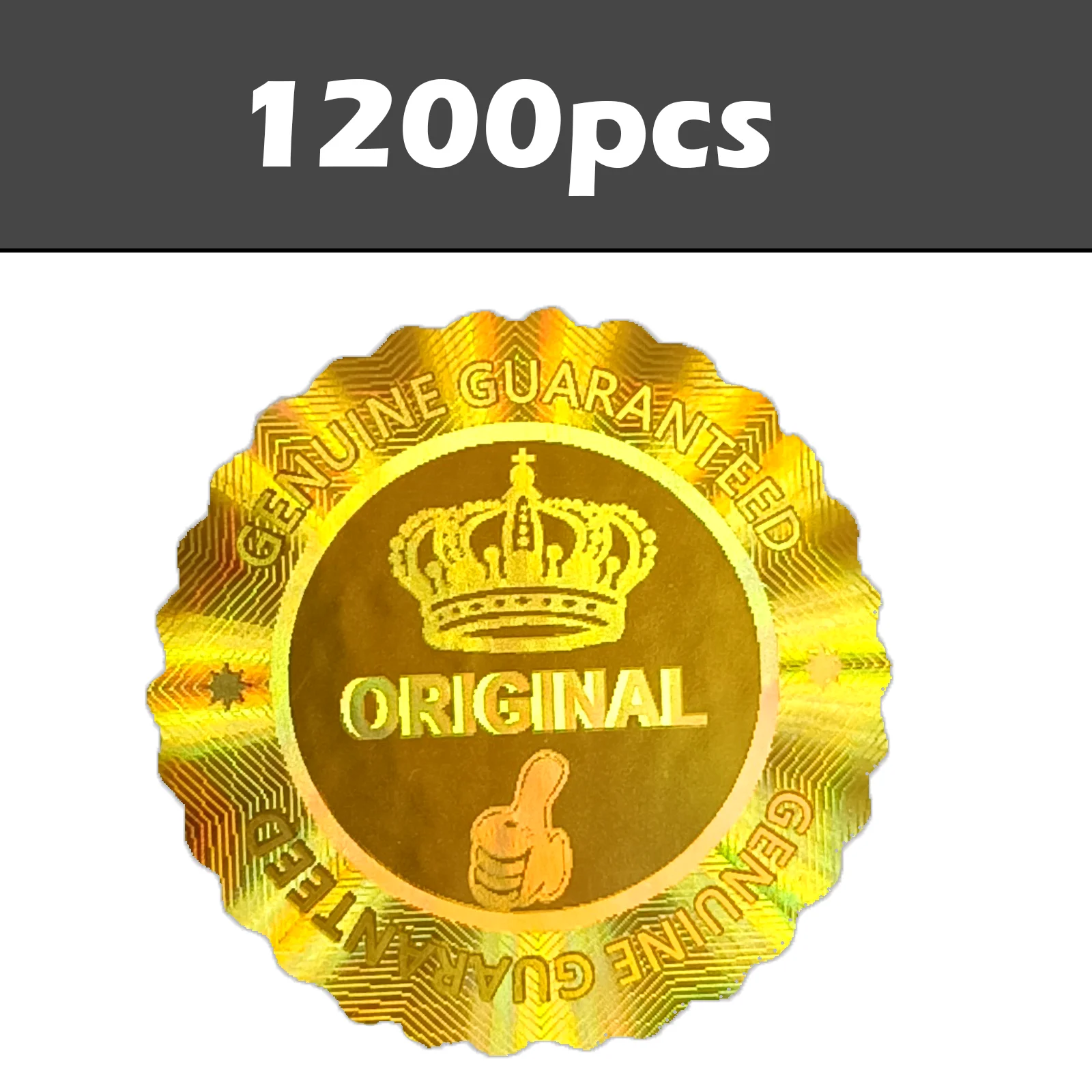 Experience the perfect blend of elegance and security with this visually striking holographic tamper-evident sticker. Measuring 2.5 cm in diameter, it features an intricate lace-like border that adds a refined touch. The holographic surface shifts colors in bright gold or silver hues, creating a luminous, eye-catching effect that captures light beautifully. Central to the design is a regal crown logo above the bold word “ORIGINAL,” emphasizing authenticity. Encircling the main graphic is a curved ring of text stating “Genuine Guaranteed,” reinforcing trustworthiness. Designed to ensure product and resource security, these stickers leave a permanent mark once removed, easily revealing tampering attempts. Their versatile design makes them ideal for various applications, providing both beauty and peace of mind.