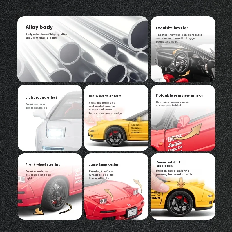 Step into the world of high-performance cars with this meticulously crafted Honda Acura NSX NA1 1:22 diecast model. Its sleek white body showcases smooth flowing lines and a sporty silhouette, capturing the essence of the original supercar. The contrasting black roof adds elegance, while tiny details like the rectangular pop-up headlights and subtle grille highlight its authentic design. Black multi-spoke wheels with striking red brake calipers enhance its realism, and transparent side windows reveal a finely detailed interior. A rear spoiler hints at its racing spirit, making this model perfect for display. Experience the perfect blend of craftsmanship, authenticity, and visual impact, bringing your collection to life.