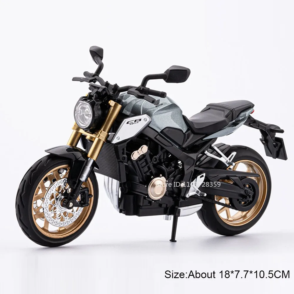 Experience the thrill of riding with this highly detailed 1:12 scale Honda CB650 model. Crafted with a sturdy metal diecast body, it captures the sleek, modern aesthetics of the original bike, featuring a matte silver finish with black and gold accents. The realistic rubber tires are equipped with shock absorption, allowing you to appreciate its smooth glide over various surfaces. Functional front wheel steering lets you emulate real riding movements, while the integrated sound and light features add to its authenticity, with the headlight turning on at the press of a button. Its compact size makes it a perfect display piece or collectible that brings the dynamic style of Honda to life.