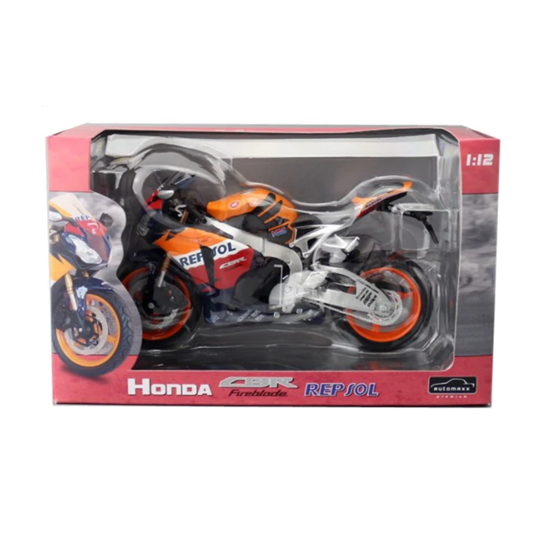 Bring your passion for high-performance motorcycles to life with this meticulously crafted 1:12 scale diecast Honda CBR Fire Blade model. Made from alloy and plastic, this replica captures every detail of the original racing machine, from the aerodynamic fairings to the spoked rims. The vibrant color scheme features a sleek combination of white, orange, and black, complemented by bold “Repsol” branding that truly embodies the spirit of racing. Its realistic design emphasizes fine craftsmanship, including molded tire treads, detailed control levers, and a clear windshield. Whether displayed on a shelf or used as a collectible, this model allows you to relive the thrill of MotoGP racing in a compact form. It’s an ideal gift for enthusiasts who appreciate precision and authenticity.