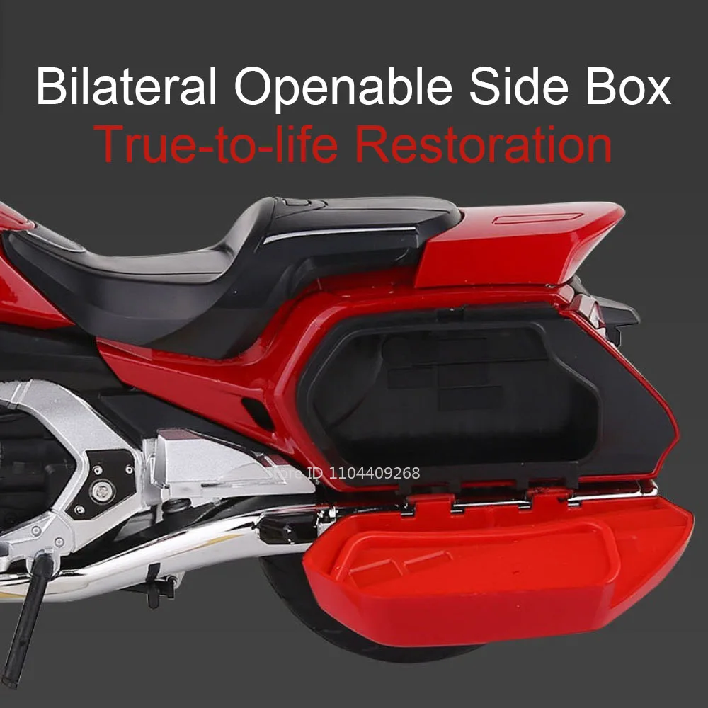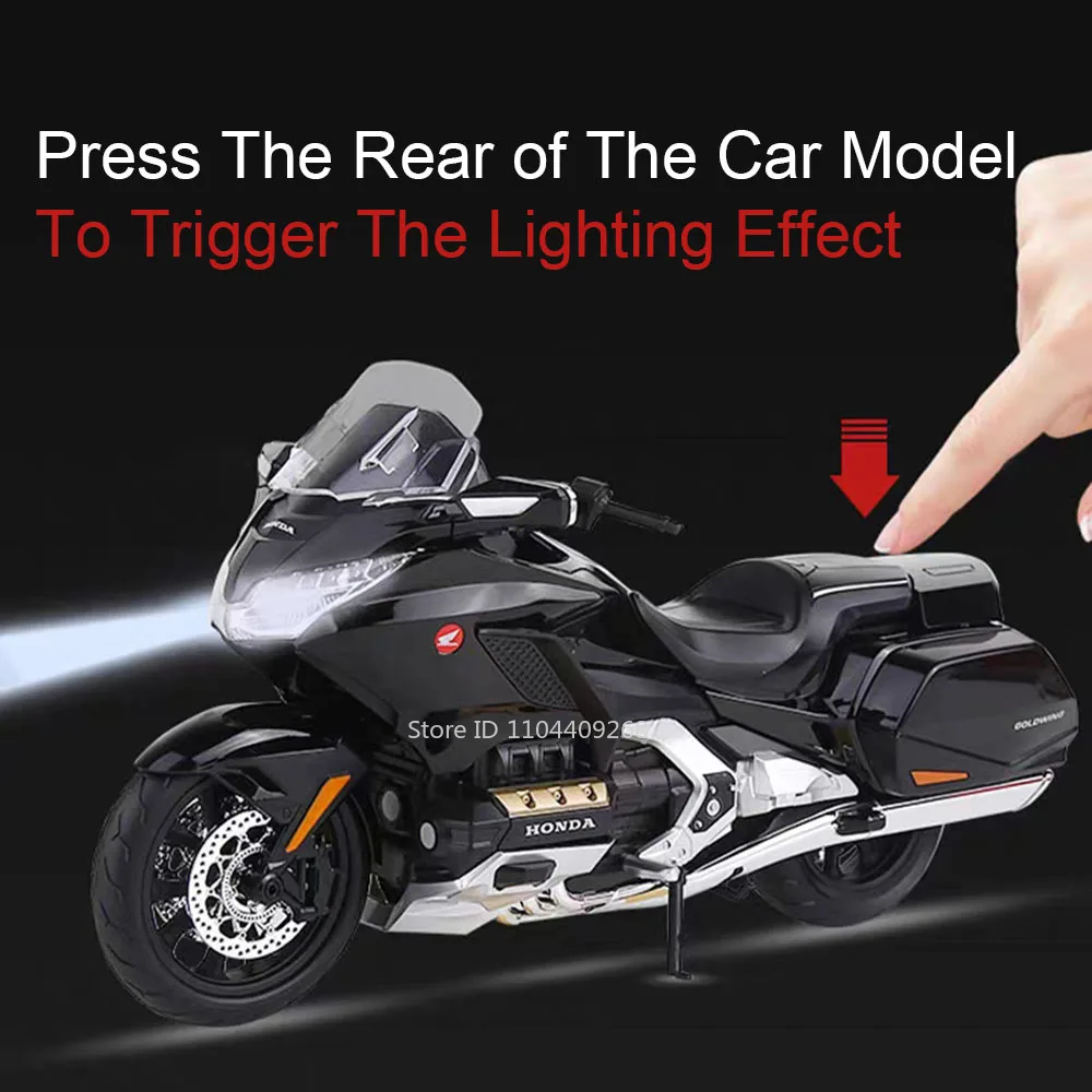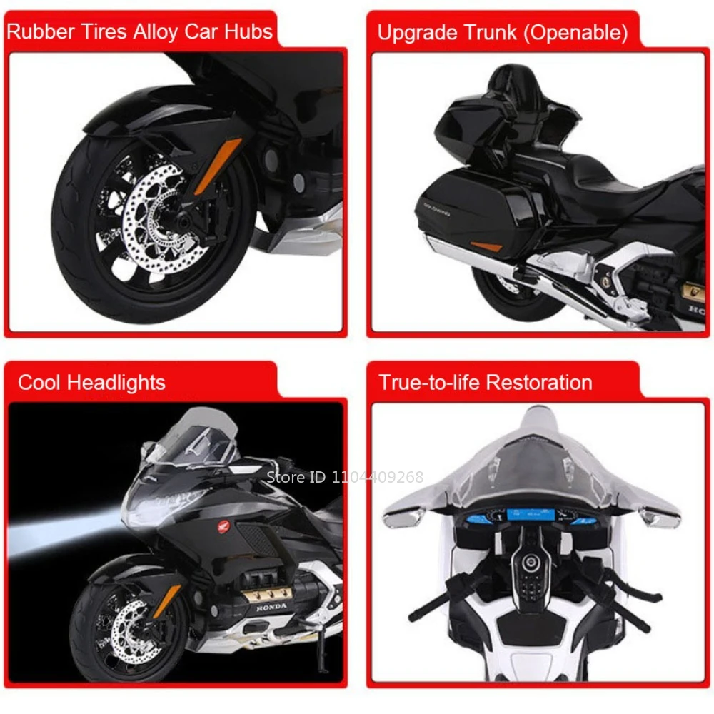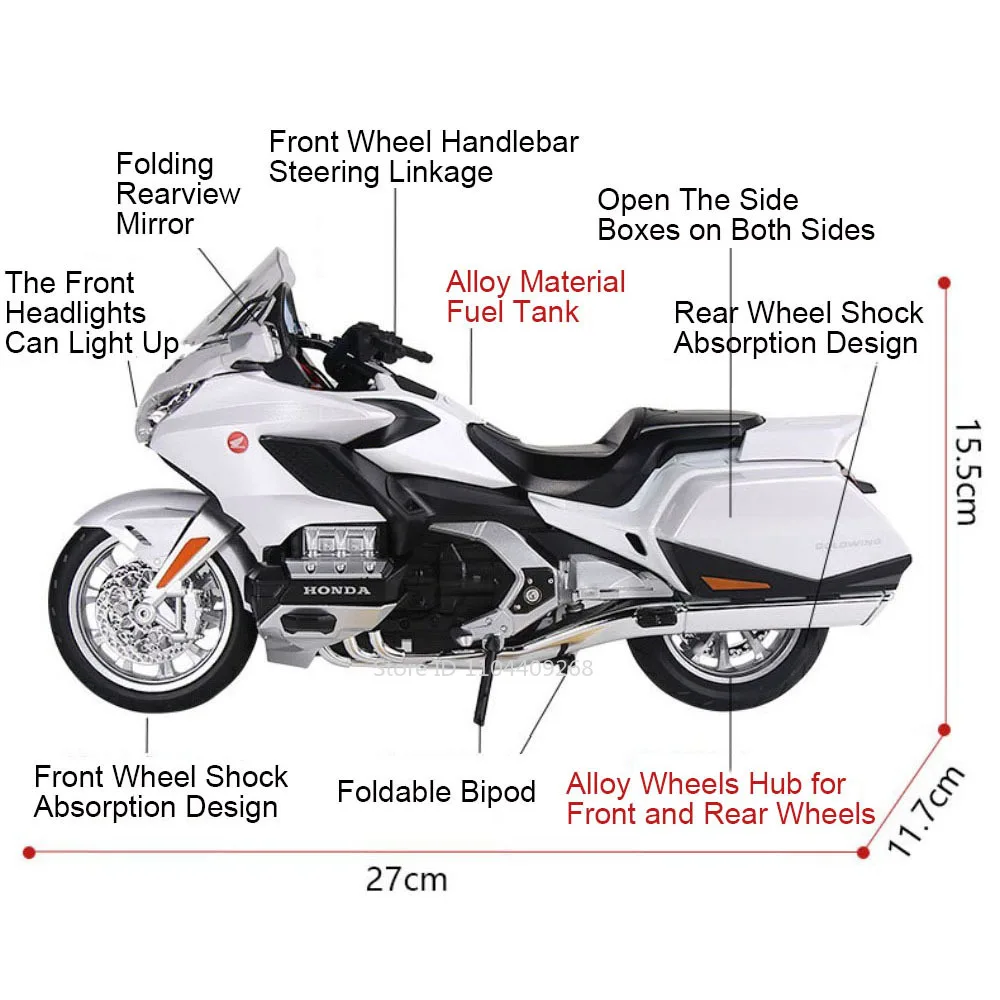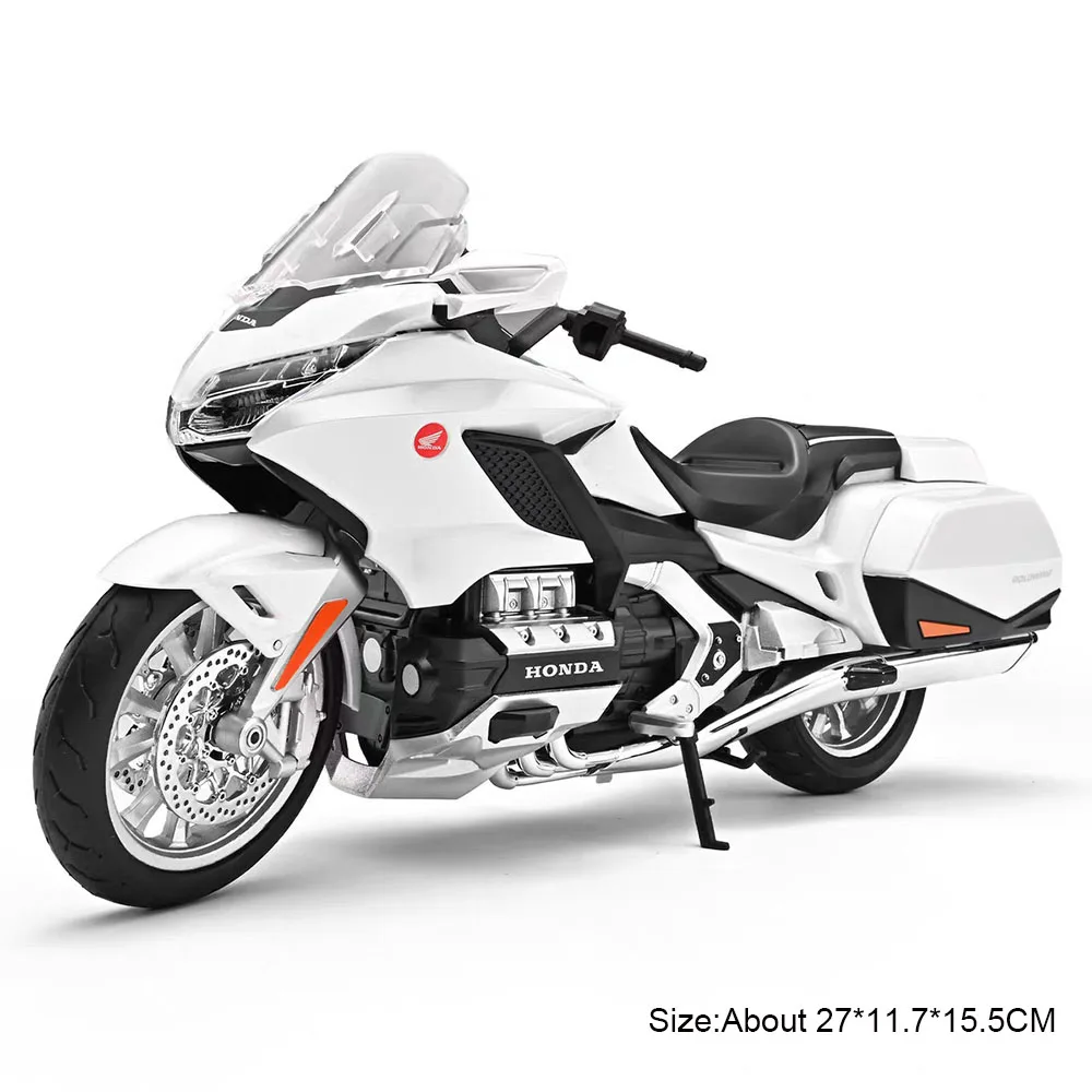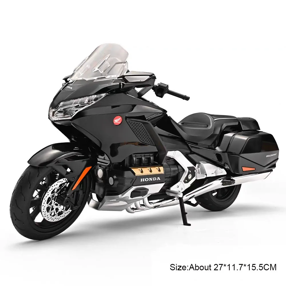 Experience the thrill of owning a highly detailed and vibrant Honda motorcycle replica. Crafted from durable metal, this model showcases exceptional craftsmanship with glossy, eye-catching finishes in colors such as CBR1000 Red, White, and GL1800 Black, Red, and White. Its aerodynamic design features flowing fairings, a large curved windshield, and chrome-finished exhaust pipes, creating a realistic appearance. The model is equipped with functional LED lights, front wheel steering, shock absorption, and a retractable tripod stand, allowing for engaging display and interactive enjoyment. This impressive piece enhances any collection or decor, giving you a sense of owning a high-performance motorcycle in miniature form—ideal for display and passionate enthusiasts alike.