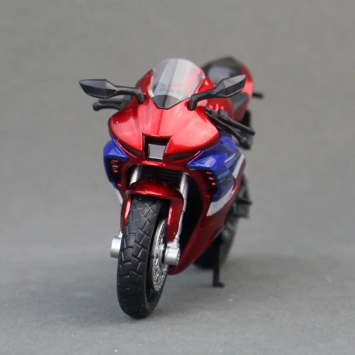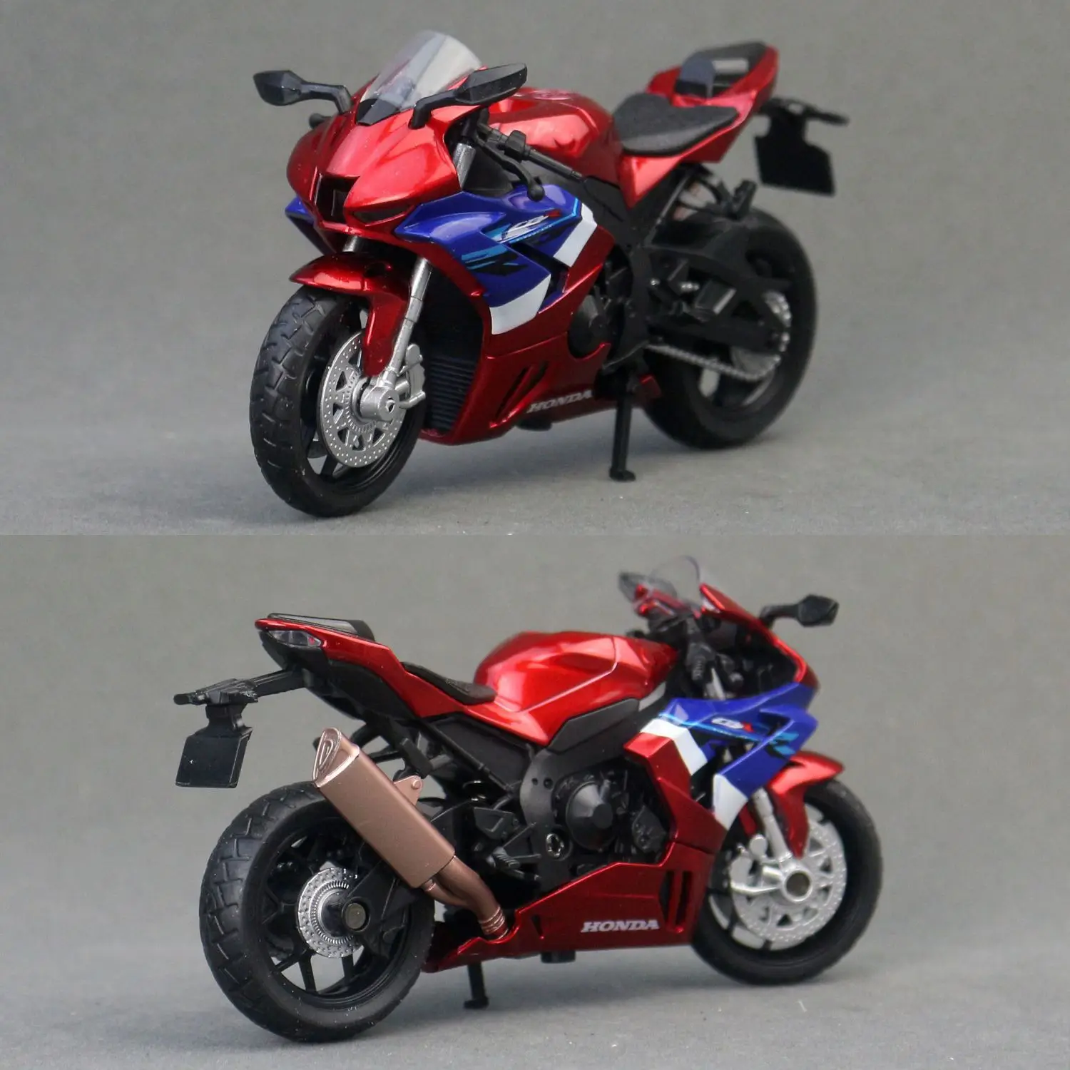 Imagine adding this stunning miniature of the iconic Honda CBR1000RR to your collection or display. Crafted with precision from durable alloy and plastic, this 1:18 scale model features bold red fairings with detailed blue, white, and black racing accents. Its realistic aerodynamic design is highlighted by the clear, upward-tapering windshield, black handlebars, and mini mirrors, creating an authentic sports motorcycle look. The front suspension forks, disc brakes, and rotors are finished in silver, contrasting beautifully with the gold-colored exhaust pipe that curves from the engine to the rear. The rear section includes a textured black seat with a sleek tailpiece, all supported on a black display stand for easy showcasing. This model embodies craftsmanship and style for enthusiasts or collectors alike.