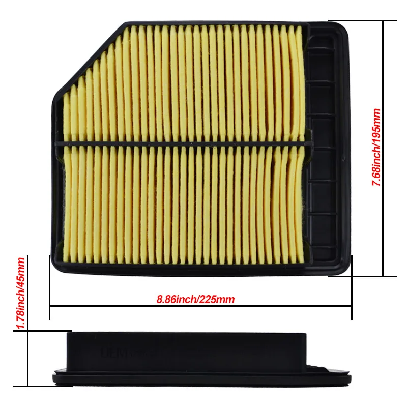 The OEMASSIVE Car Engine Air Filter is designed for Honda Civic models from 2006 to 2011 (1.6L, 1.8L) and Honda FR-V EDIX from 2007 to 2009 (1.8L). With dimensions of 8.86″ (225mm) in length, 7.68″ (195mm) in width, and 1.78″ (45mm) in height, it features a sturdy black plastic frame surrounding a yellow filter paper core, designed with multiple pleats for enhanced dirt trapping. Weighing 0.35 kg and made of filter paper, rubber, and plastic, it is recommended to replace it every six months or after 10,000 kilometers to maintain optimal engine performance. Interchange Part Numbers include 17220-RNA-Y00, 17220-RNA-A00, 17220-RND-M00, and 17220-RNA-M00.