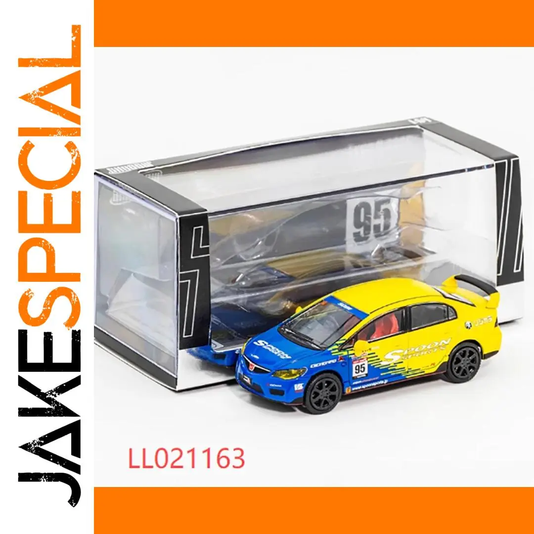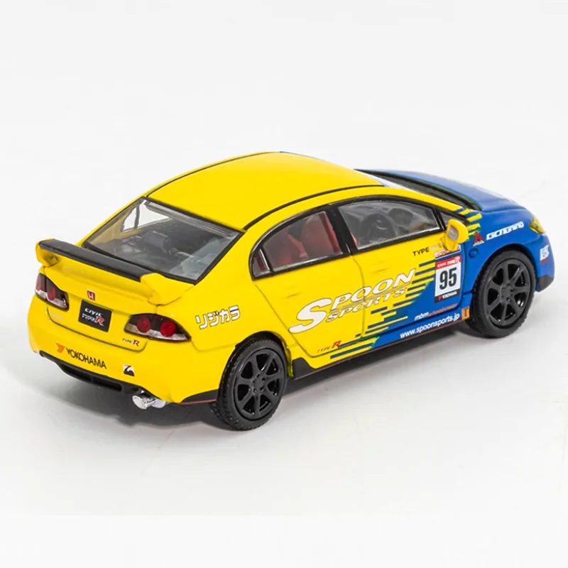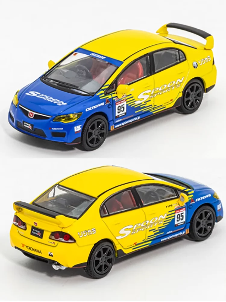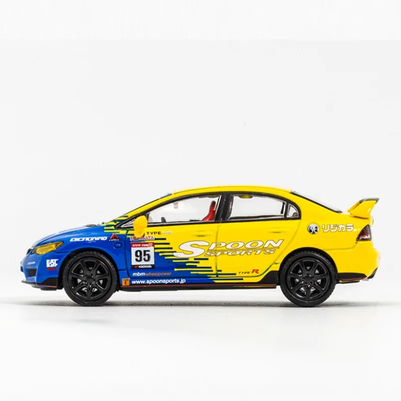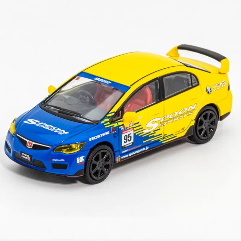 Experience the thrill of racing with this detailed 1:64 scale diecast alloy model of the Civic Type-R FD2, featuring a vibrant blue and yellow livery accented with racing decals, including the number “95” and “Spoon” branding. Crafted from durable metal, it showcases aerodynamic details like a yellow rear wing spoiler, sleek black wheels, and realistic front grille, headlights, and side mirrors. The transparent windows reveal a glimpse of the interior, emphasizing its high-performance appeal. Ideal for collectors aged 18 and over, this meticulously designed model is perfect for display, capturing the spirit of motorsports with precision and style.