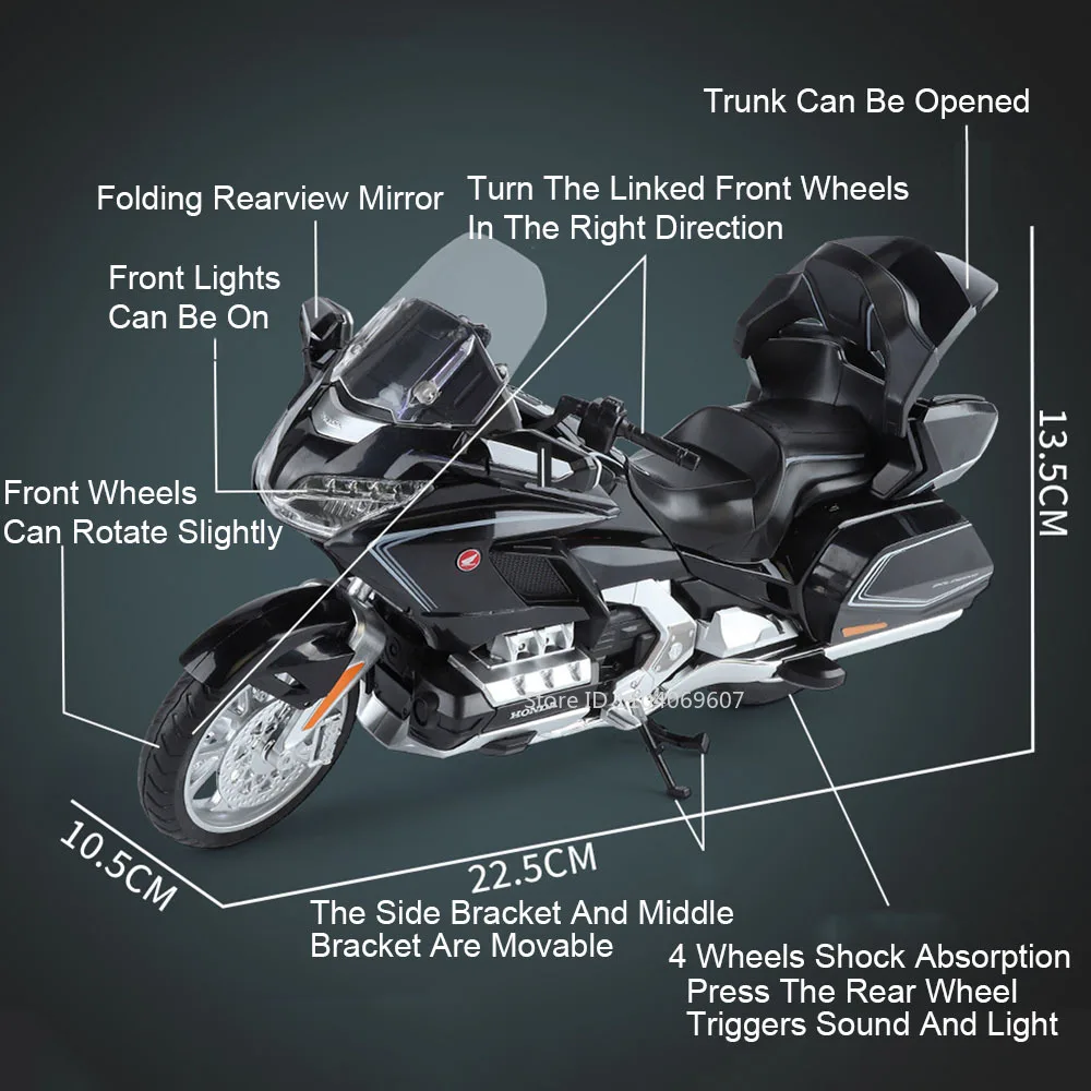 Discover the striking realism of this Honda Gold Wing GL800 2021 model toy motorcycle, meticulously crafted at a 1:11 scale. Its sleek black finish, complemented by silver and gray accents, captures the essence of a touring motorcycle with high precision. The metal diecast body and plastic chassis provide durability and a lightweight feel, while rubber tires with realistic textured treads enhance authenticity. This model features a variety of impressive functions, including sound and light effects, shock absorption wheels, and a front wheel steering mechanism connected to the handlebar. The pull-back feature allows it to move forward smoothly, just like a real motorcycle in motion, making it an attractive addition for enthusiasts and collectors alike.