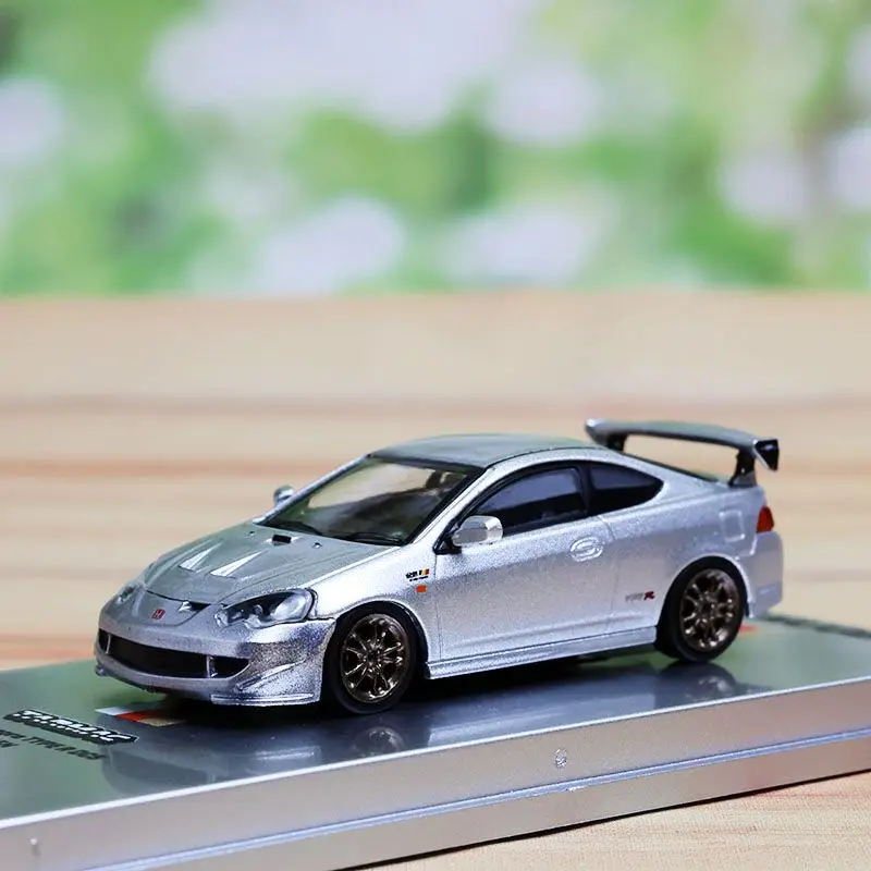 This highly detailed 1:64 scale diecast model of the Honda Integra Type R DC5 Mugen version features a durable alloy construction with a metallic silver finish, glossy surface, and realistic design details. The aerodynamic bodywork includes a prominent rear spoiler, detailed headlights and taillights with clear and red elements, black multi-spoke wheels with visible brake discs, and tinted black windows. Made from metal, plastic, and rubber, this collectible model is perfect for display, gifting, or home decor, highlighting craftsmanship without flaws. Suitable for ages 14 and up, it requires no batteries or electrical components, offering an authentic and sporty aesthetic for enthusiasts and collectors.