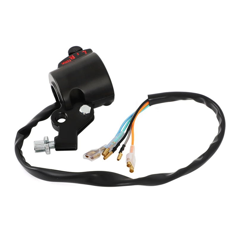 This black handlebar switch assembly is a high-quality reproduction designed for the left clutch side of Honda motorcycles, including models CB175 (1971-1973), CB200 (1974), CB350 (1972), CB350F (1972-1974), CB350G (1973), CB450 (1971-1974), CB500 Four (1971-1973), and CB750 (1969-1971). Made from durable ABS plastic, it measures 12 cm in length, 7 cm in width, and 8 cm in height, weighing approximately 0.2 kg. Features a factory-style wiring harness with plug compatibility, accommodating factory clutch levers, cables, and mirrors. Its sleek, factory appearance, with integrated illuminated markings, ensures perfect OEM fitment and reliable functionality for your restoration or repair.