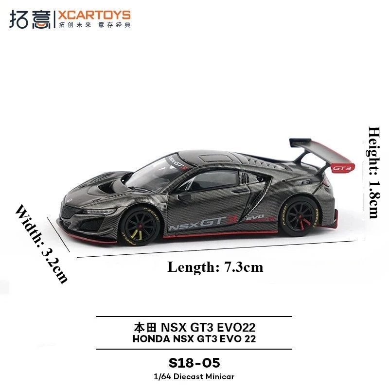 Enhance your collection with this highly detailed 1/64 scale diecast model of the Honda NSX GT3 EVO22, featuring a sleek black alloy finish with color code S18-05. Crafted from durable metal with a realistic carbon-fiber textured surface, this static miniature showcases authentic racing design elements, including a low, wide stance, a prominent front splitter, detailed side panel lines, and a large adjustable rear wing adorned with red “GT3” branding. The model’s transparent black-framed windows, flush door handles, and intricately detailed rear diffuser, taillights, and exhaust outlets make it a striking collectible. Suitable for ages 14+, it is perfect for display and inspiration for motorsport enthusiasts.