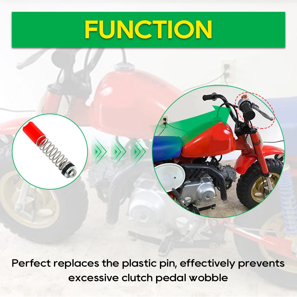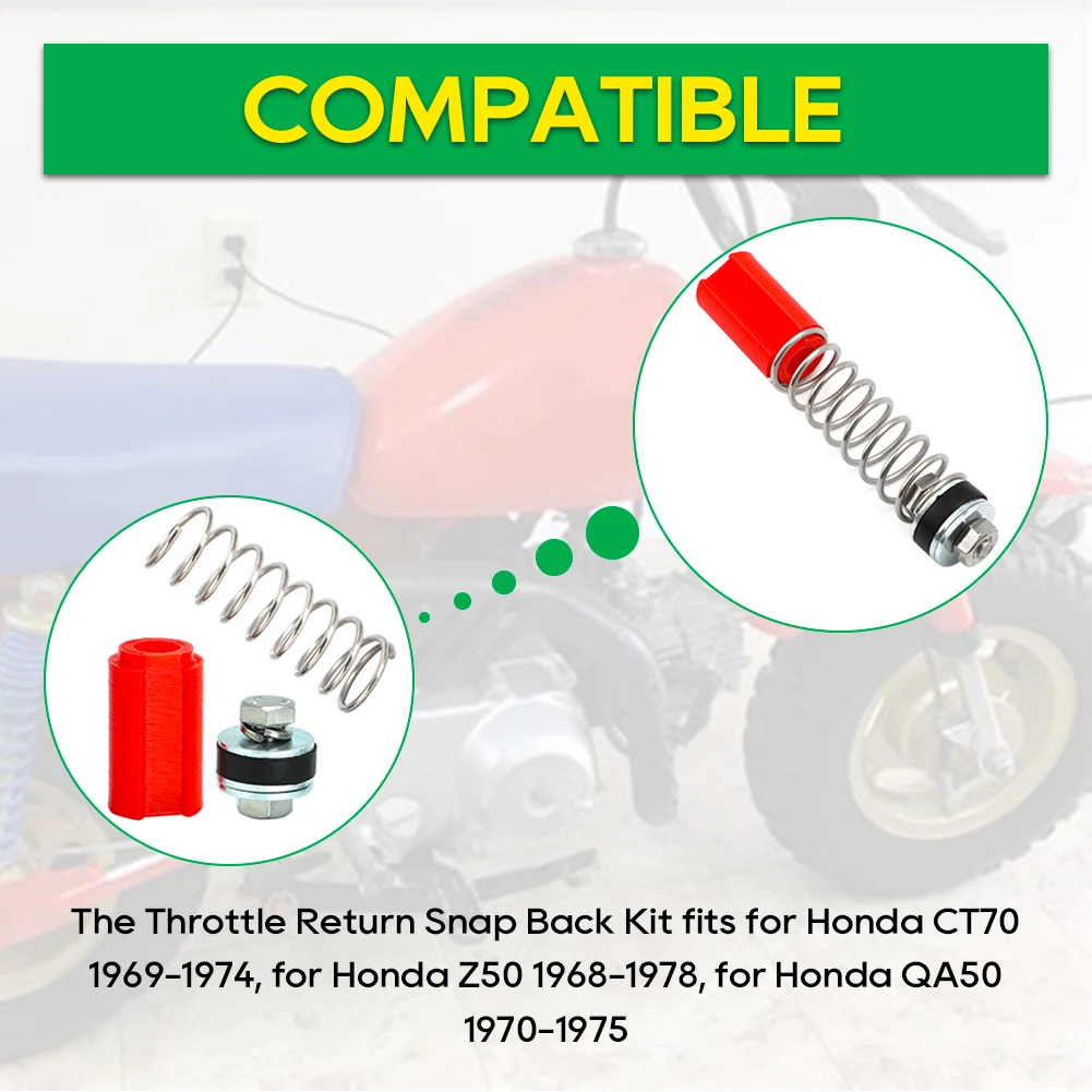 Enhance the responsiveness of your Honda motorcycle with this brand new Throttle Return Snap Back Kit, specifically designed for OEM handlebars with an inner diameter of approximately 17.90-18.00mm. Compatible with internal throttle assemblies on Honda CT70 (1969-1974 USA), Z50 (1968-1978 USA), and QA50 (1970-1975 USA) models, this kit includes one set of precisely manufactured components. The kit features a red, textured rubber or plastic sleeve, a polished metallic bolt or quick-release fitting with a black rubber washer, and a durable silver-colored compression spring with evenly spaced coils. Install it to restore smooth throttle operation and enjoy enhanced control.
