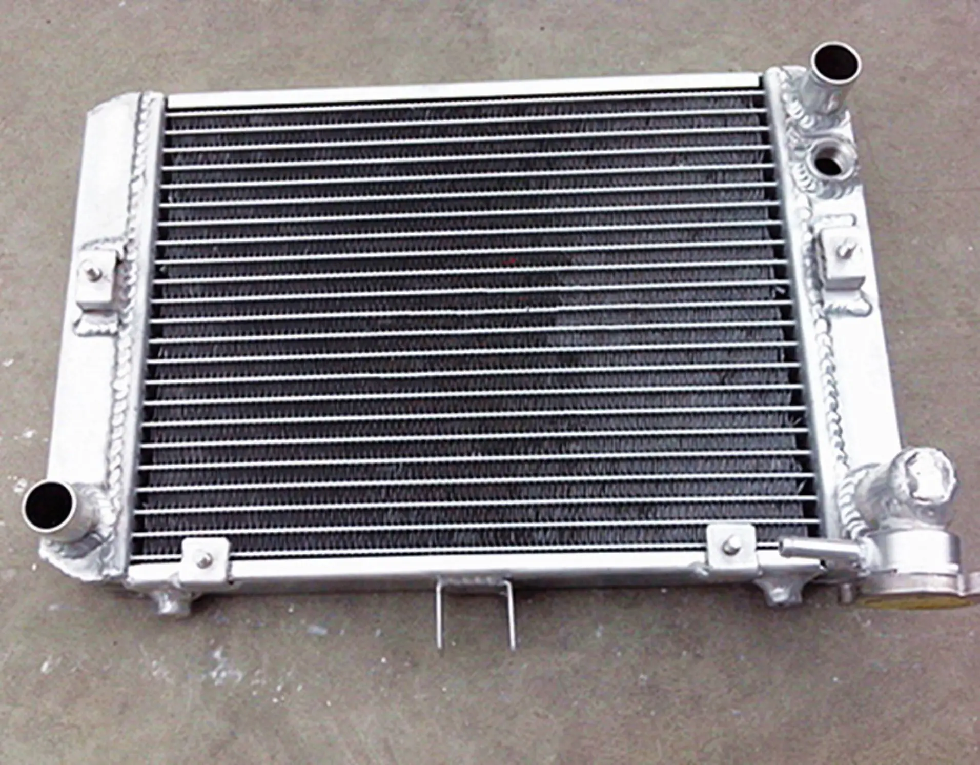 - Features polished aluminum inlet and outlet fittings for a refined industrial look, with welded mounting points for secure attachment to your motorcycle frame.