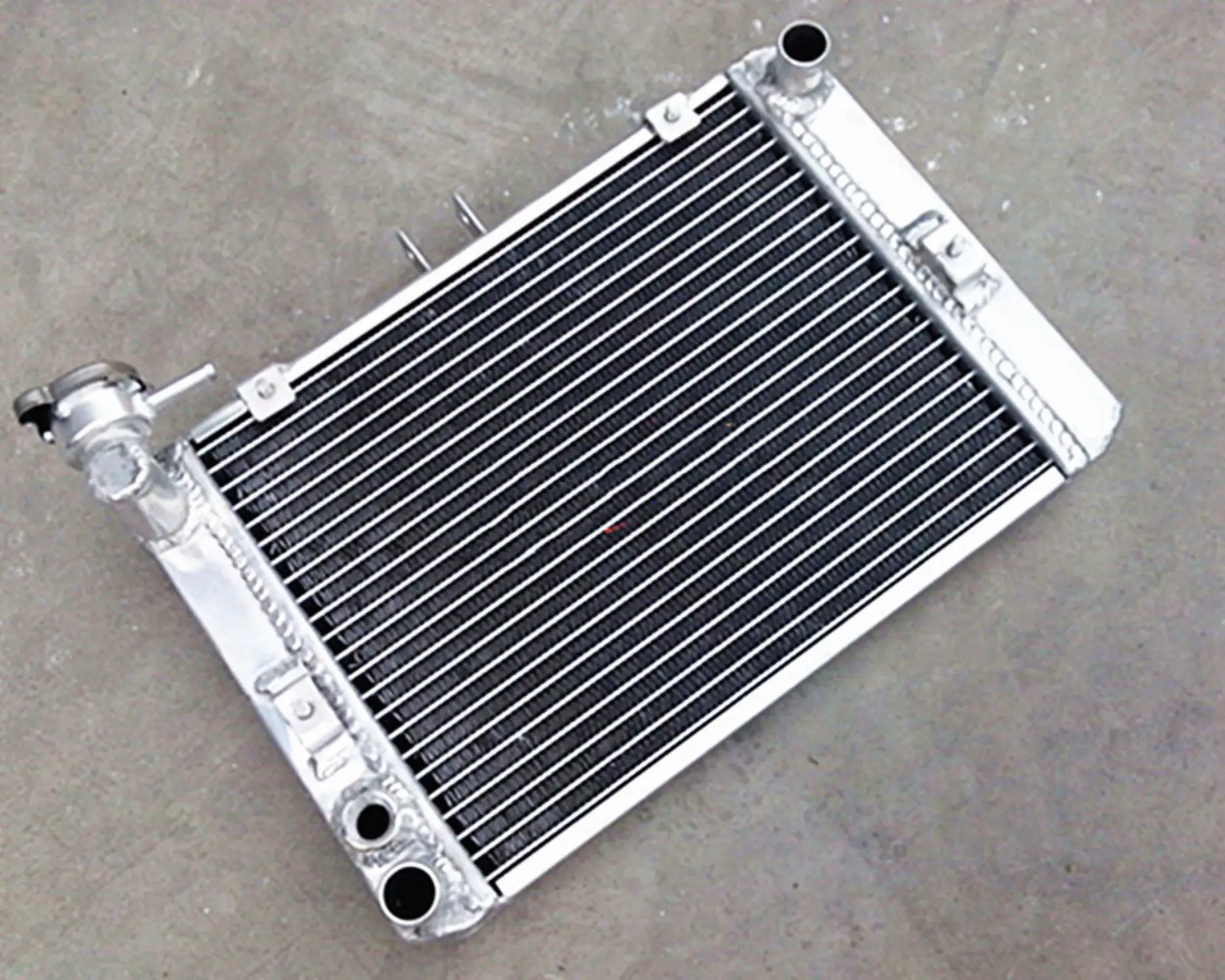 Experience superior cooling with this high-quality aluminum radiator, designed specifically for 1983-1986 Honda V65 Magna VF1100C models. Crafted from durable T-6061 aluminum, including the core and tanks, it features a sleek metallic finish and a compact rectangular shape. The dense array of black cooling fins in the central core enhances heat dissipation, giving your motorcycle a sharp, modern look. The inlet and outlet fittings are polished aluminum cylinders, seamlessly integrated at the top corners for easy hose attachment. This radiator’s robust construction, with TIG-welded tanks and vacuum-brazed core, ensures high durability and reliable performance. Imagine your bike running cooler and more efficiently, even during intense rides, thanks to this premium aftermarket upgrade. It’s a perfect blend of style, strength, and functionality.