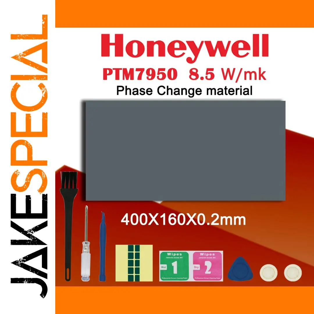 Experience superior thermal management with this high-performance Honeywell PTM7950 phase change thermal pad. Measuring 400mm by 160mm with a sleek 0.2mm thickness, it features a uniform, smooth gray surface that ensures optimal contact with your electronic components. Its advanced phase change technology activates at 45°C, providing an efficient heat transfer of 8.5 W/m·K. Designed for lasting reliability, this pad withstands temperatures up to 150°C for 1000 hours and endures 1000 thermal cycles. Its excellent interface wettability guarantees low surface contact resistance, making it ideal for CPUs, GPUs, laptops, gaming consoles, and other high-performance systems. The product's minimalist, industrial aesthetic emphasizes practicality and durability, seamlessly blending function and modern style in your setup.
