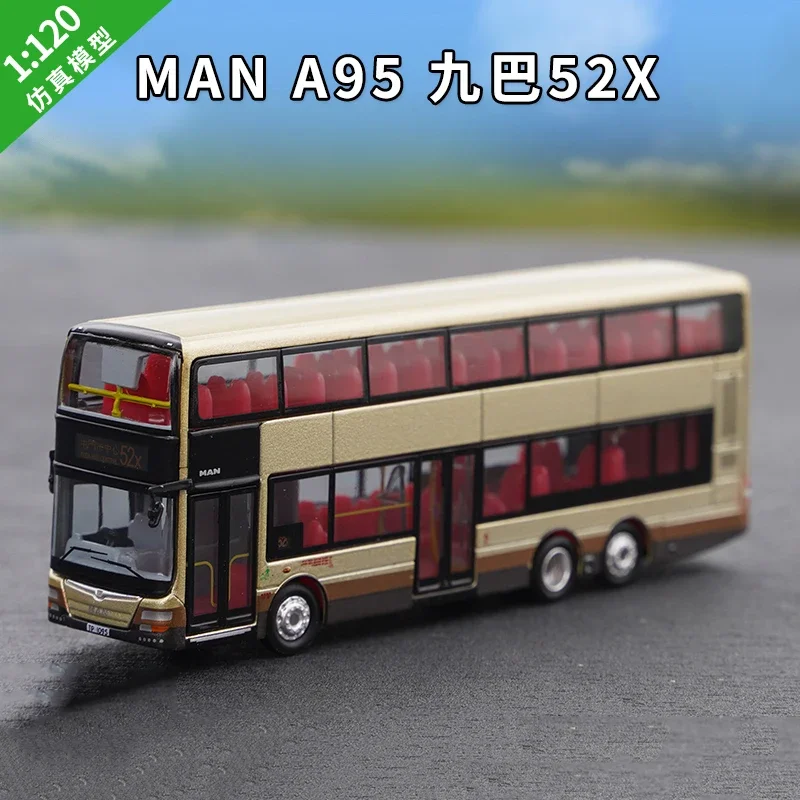 This detailed 1:120 scale diecast replica of a Hong Kong double-decker bus is crafted from alloy and plastic, perfect for collectors and decor enthusiasts. Featuring vibrant red or pink-tinted windows for the upper deck and a beige or light brown body with black window frames, it showcases realistic front design with a curved windshield, silver bumper, small side mirrors, and silver wheels with rubber tires. The model includes painted stripe details along its sides, reflecting a sophisticated aesthetic. Designed for adult collectors, this non-electric, decorative piece measures 1:120, with options in colors B, C, and D, making it an eye-catching addition to any collection or display.