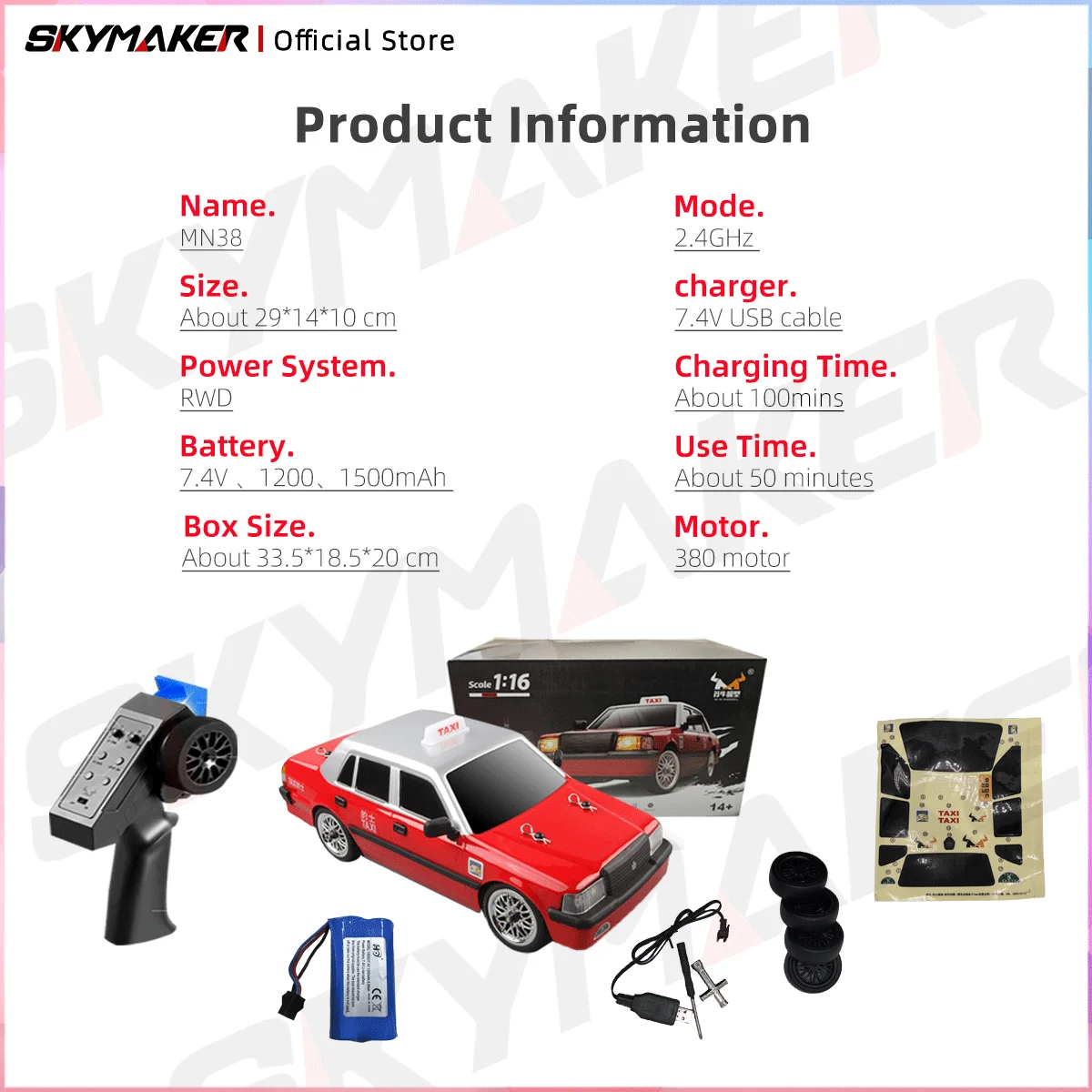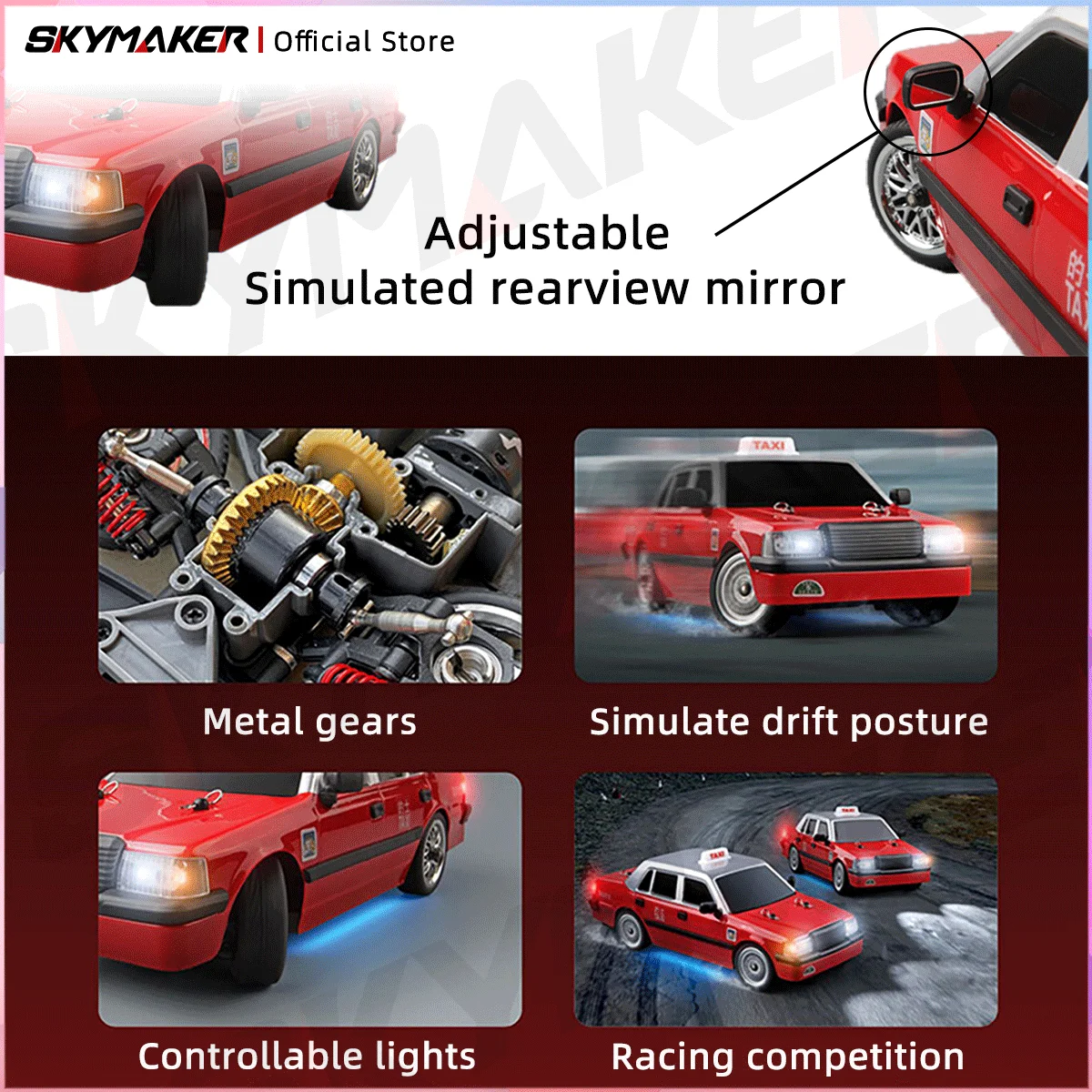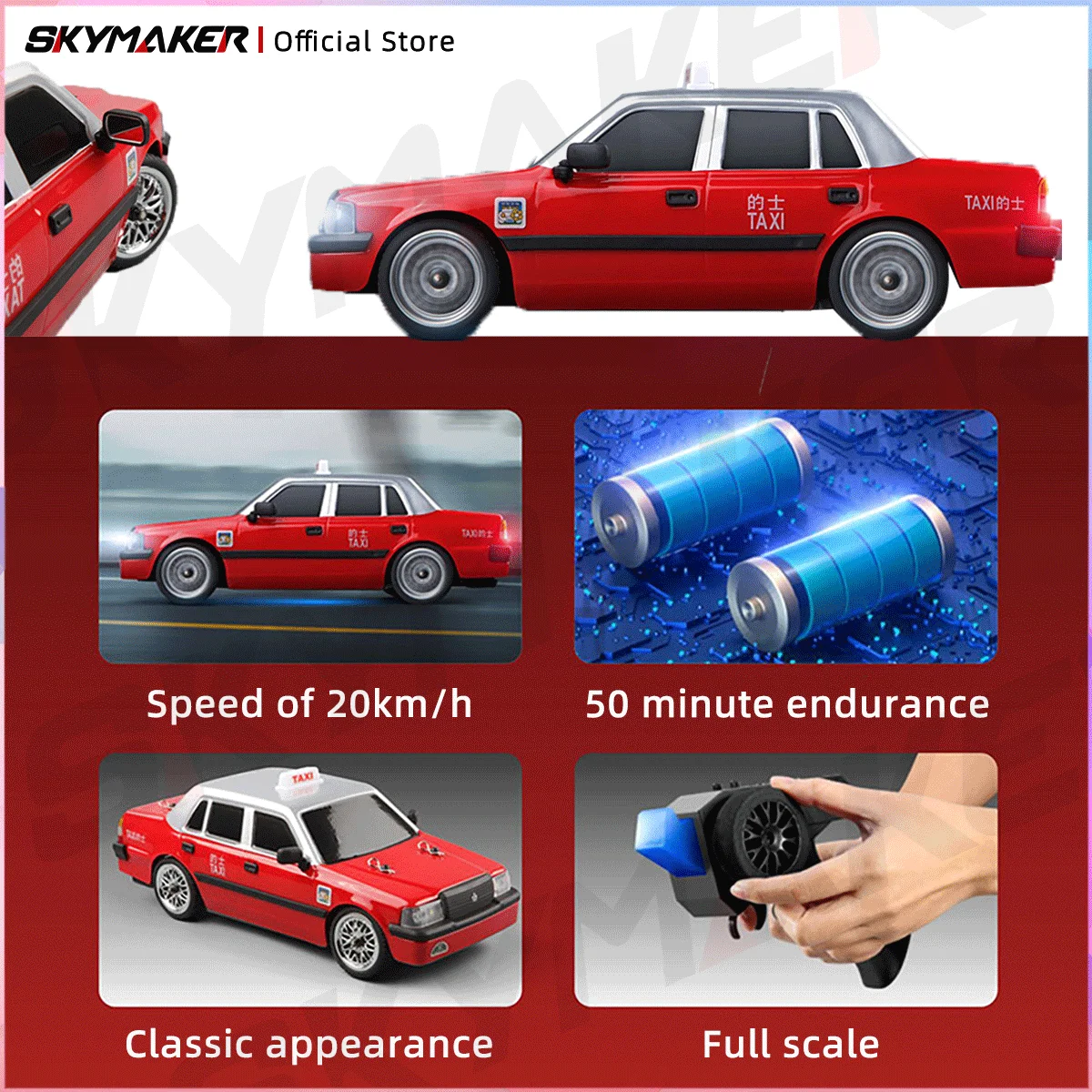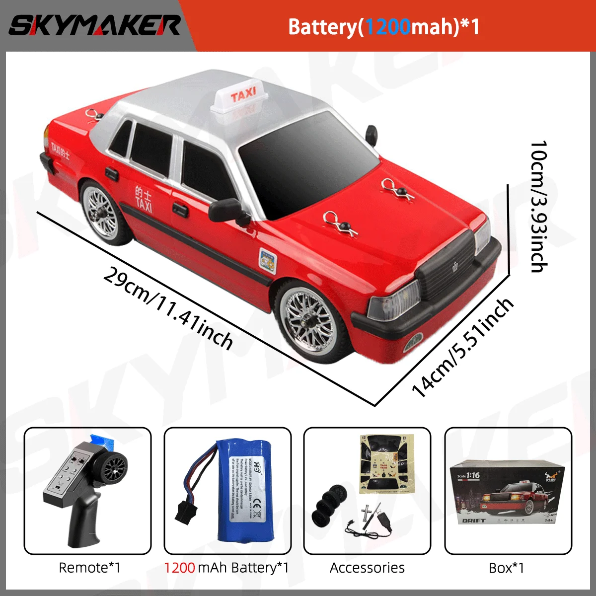 Experience the thrill of owning this meticulously crafted 1:16 scale RC drift car designed to resemble a classic Hong Kong taxi. With its bold red body accented by black details like side mirrors, front grille, and window trims, this model offers a striking urban aesthetic. Its realistic rectangular headlights, white taxi sign with red lettering, tinted side windows, multi-spoke silver wheels, and foldable mirrors highlight its authentic design. Made from impact-resistant nylon and ABS plastic, it combines durability with sleekness. Compact at approximately 290 mm long, 140 mm wide, and 110 mm high, it’s perfect for agile drifting. Lights and ambient lighting features enhance visual appeal, making every maneuver more immersive. This car is built for high-speed, high-precision performance, offering endless fun and realism.