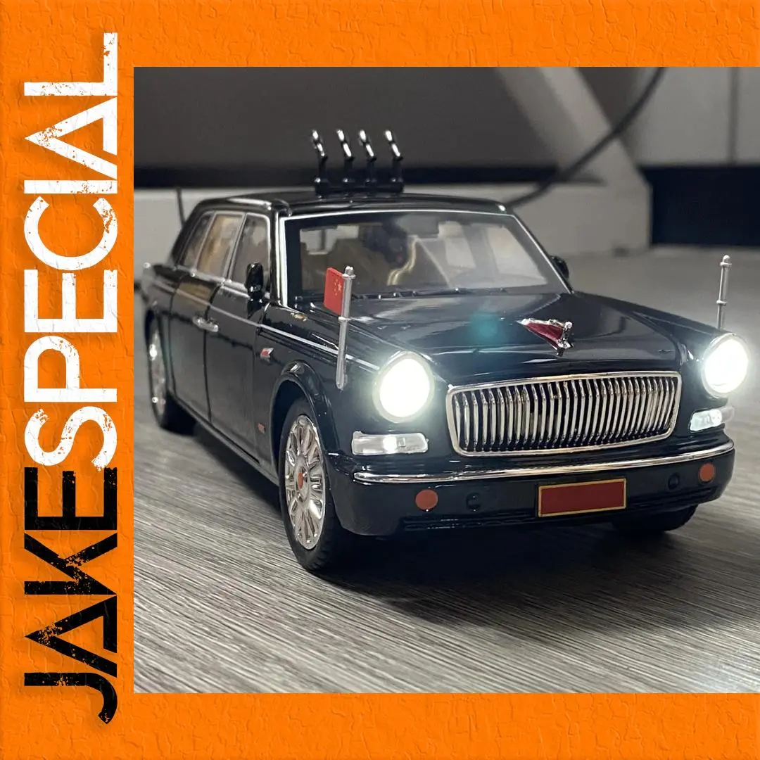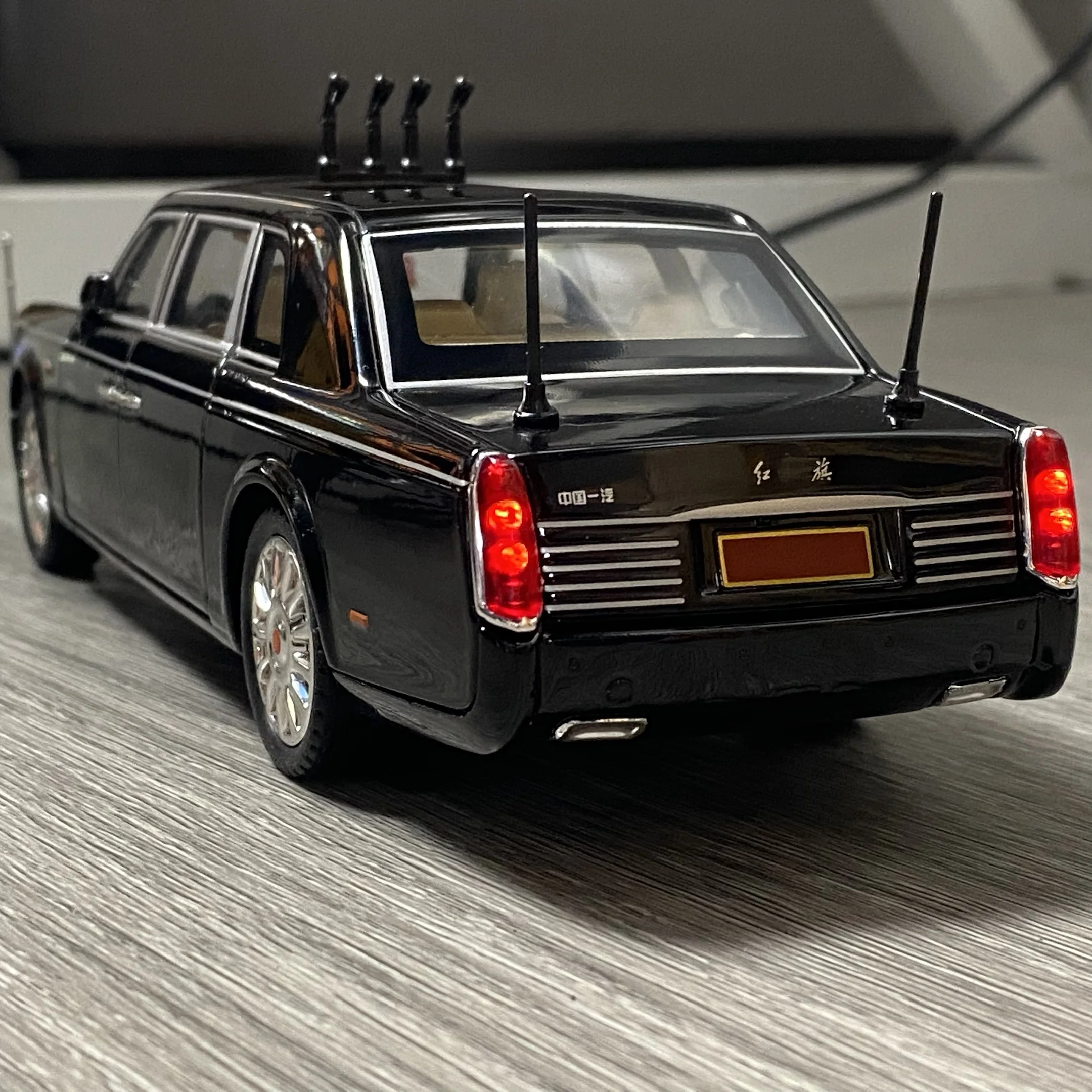 The HONG QI L5 CA770 diecast model car is a spectacular representation of luxury automobiles, crafted meticulously at a 1:24 scale from finely polished alloy metal. Its striking black exterior shines brilliantly, while the intricate detailing captures the essence of high-end vehicles. The model features realistic round headlights, an elegantly designed grille with horizontal lines, and sophisticated chrome accents. Inside, the tan upholstery contrasts beautifully with the exterior, offering a glimpse of true luxury. This model includes sound and light functionalities powered by a button battery, making it a standout collectible for enthusiasts. Every detail reflects a commitment to quality, making it a perfect addition to any collection.
