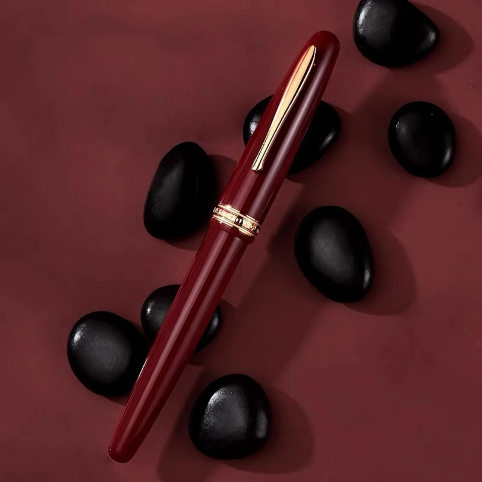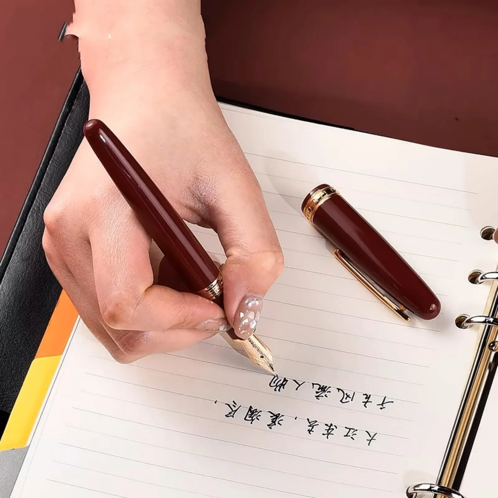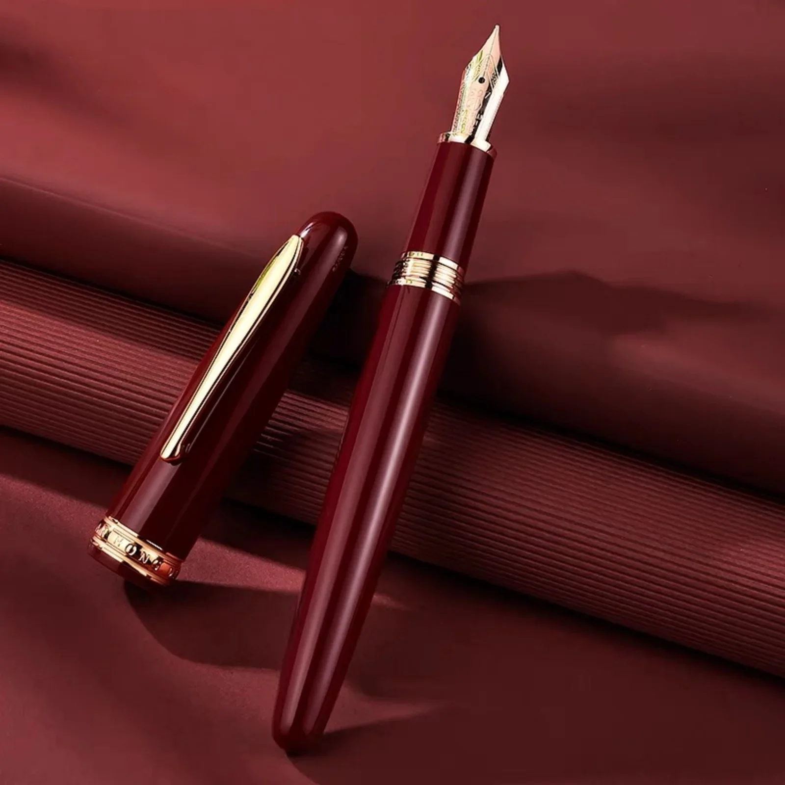 Experience the perfect blend of luxury and craftsmanship with this elegant Hongdian 1841 Resin Fountain Pen. Designed for professional and refined writing, its smooth resin body boasts a glossy finish available in classic black and rich red. The polished gold accents, including a clip and decorative bands, elevate its premium appearance. The pen’s refined metal nib, available in fine (F) and extra fine (EF) sizes, ensures smooth, precise writing. Paired with a convenient converter, it’s ideal for office use or personal eloquence. Whether you're signing documents or jotting notes, this pen offers comfort and style. Its sophisticated look and high-quality construction make it a perfect gift or essential addition to your writing collection.