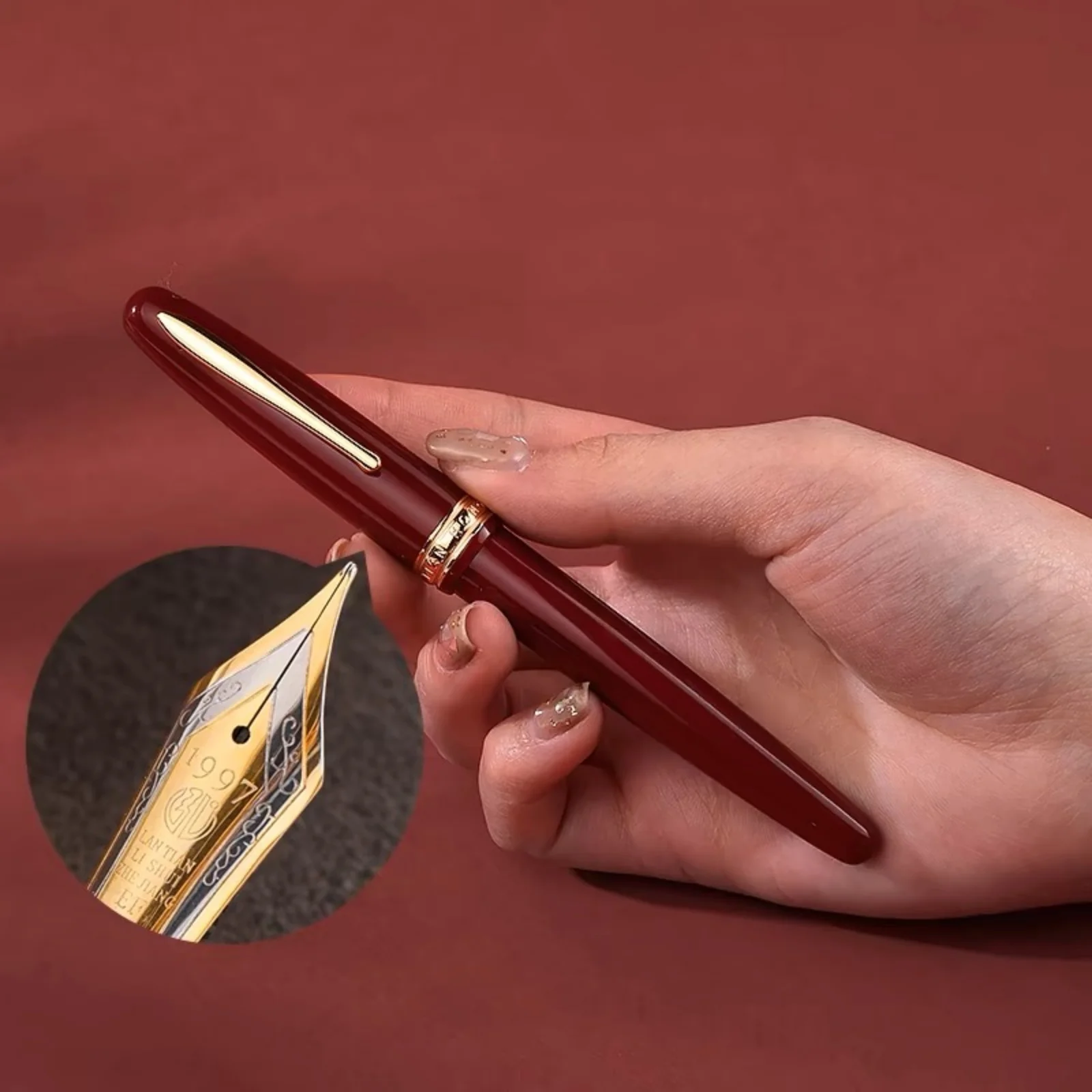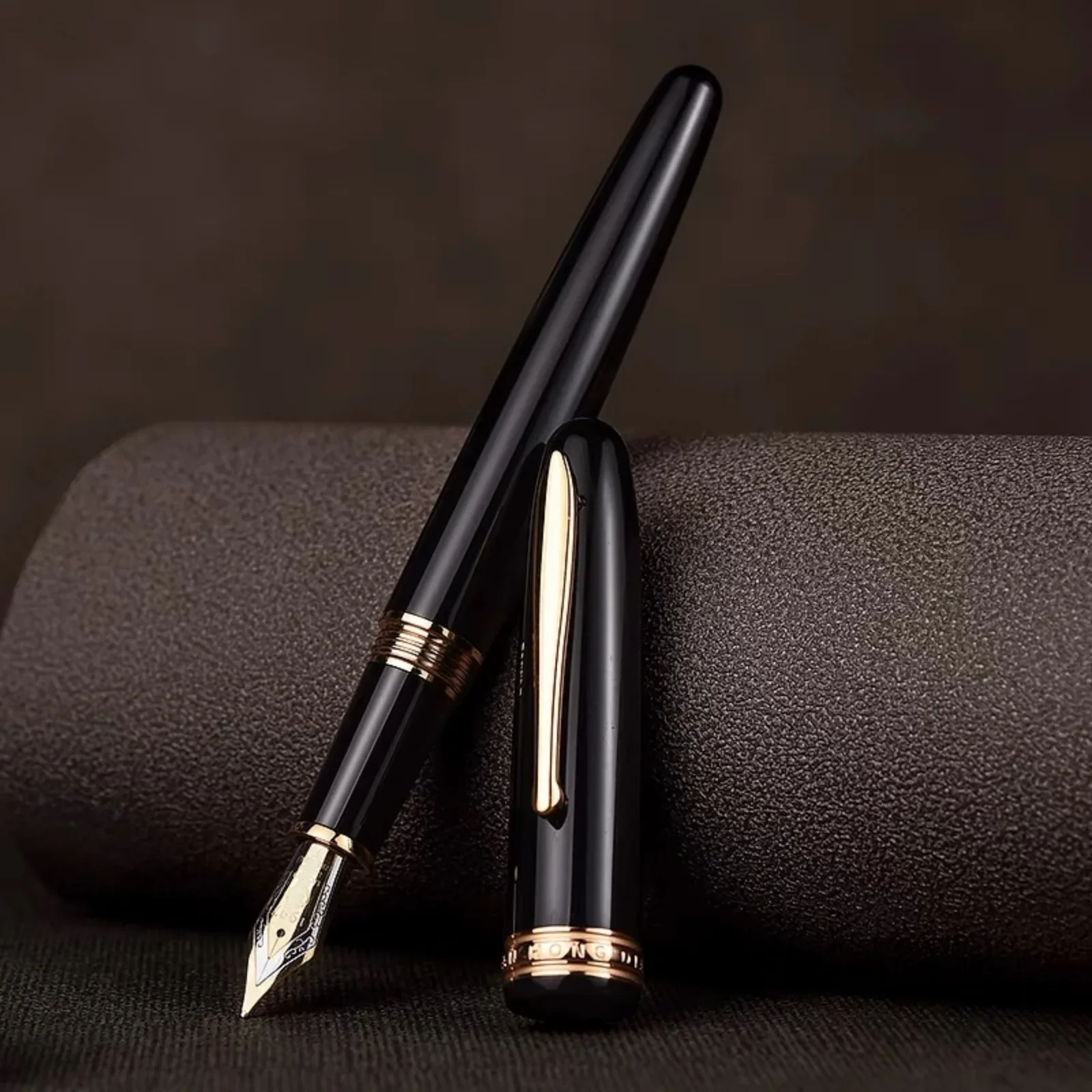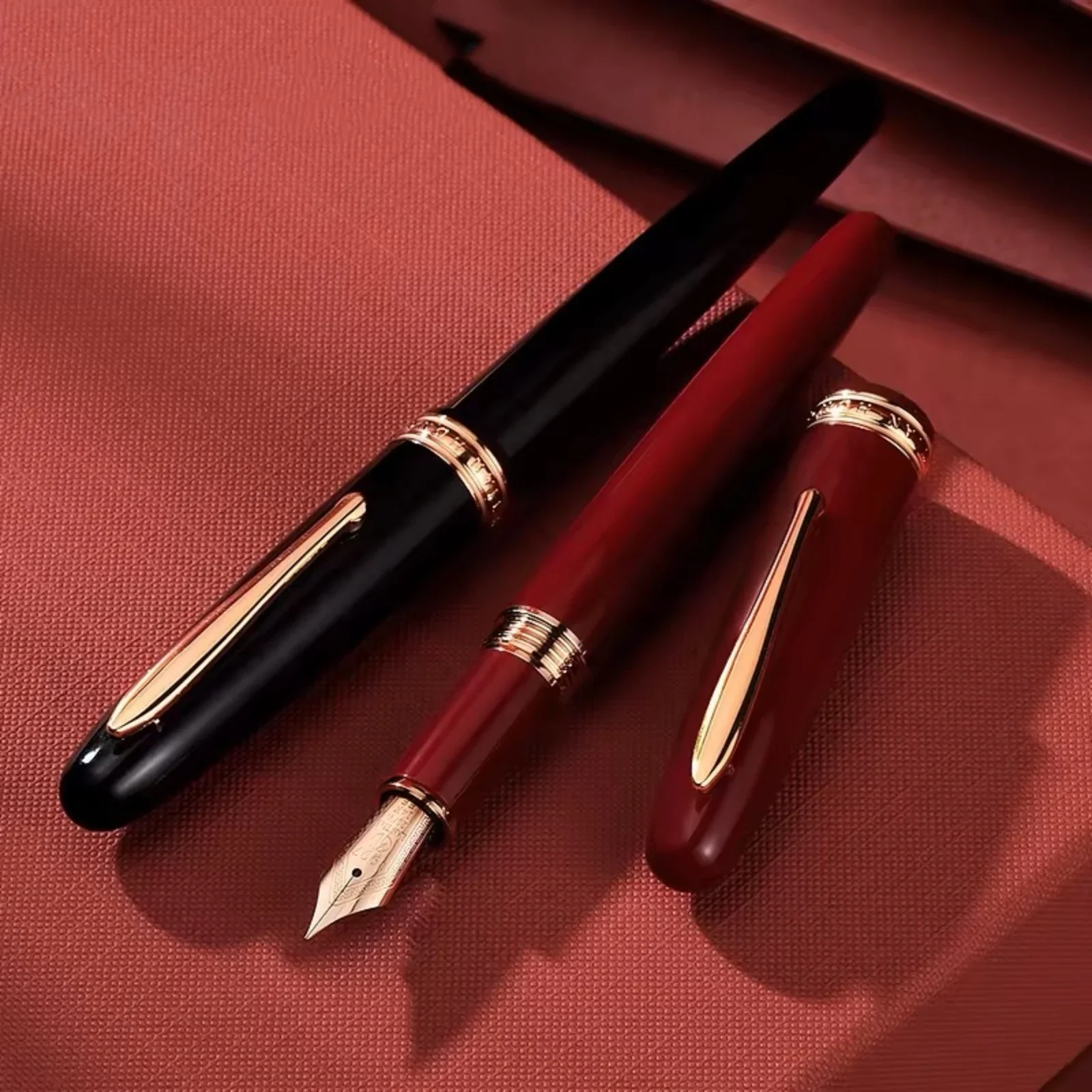 Experience the perfect blend of luxury and craftsmanship with this elegant Hongdian 1841 Resin Fountain Pen. Designed for professional and refined writing, its smooth resin body boasts a glossy finish available in classic black and rich red. The polished gold accents, including a clip and decorative bands, elevate its premium appearance. The pen’s refined metal nib, available in fine (F) and extra fine (EF) sizes, ensures smooth, precise writing. Paired with a convenient converter, it’s ideal for office use or personal eloquence. Whether you're signing documents or jotting notes, this pen offers comfort and style. Its sophisticated look and high-quality construction make it a perfect gift or essential addition to your writing collection.