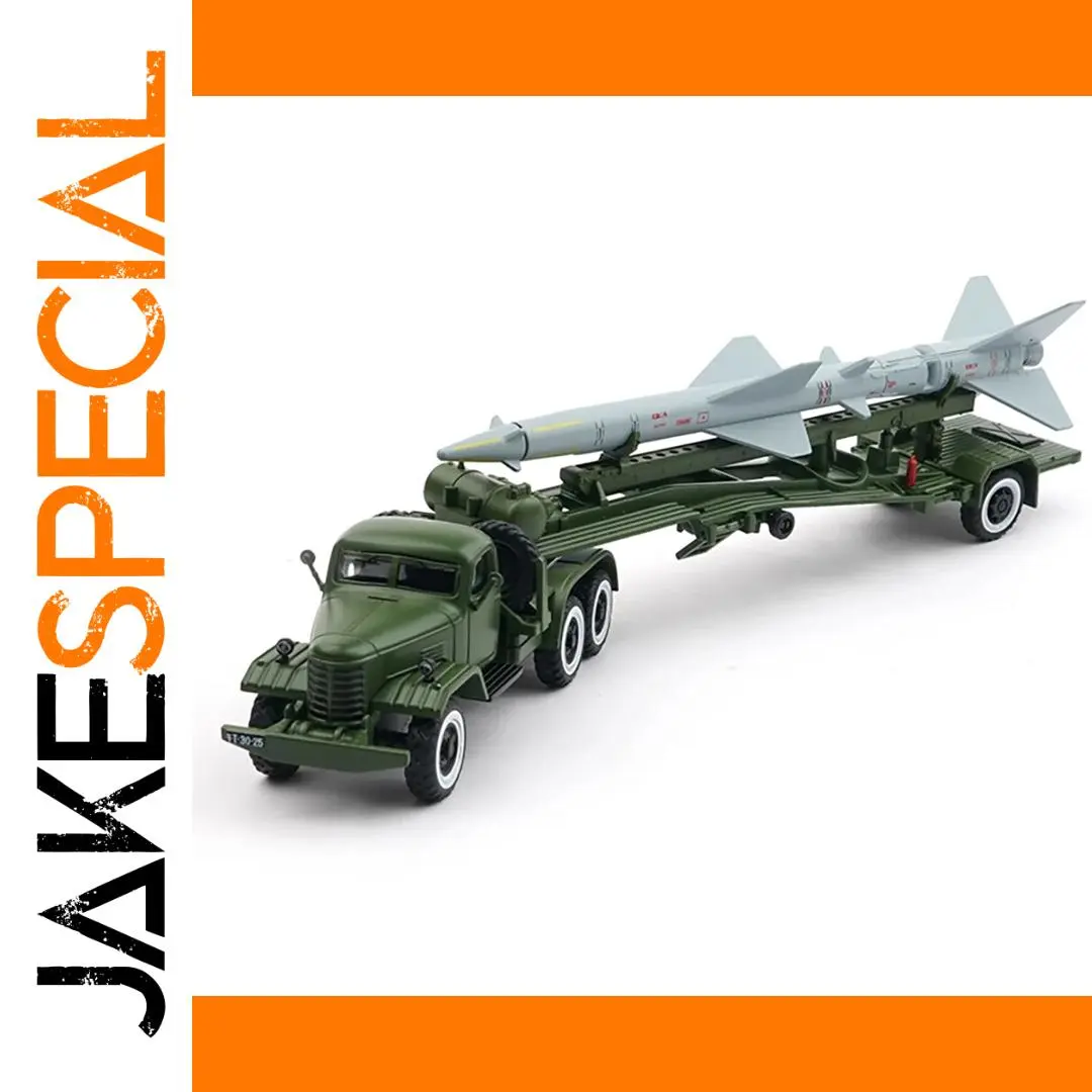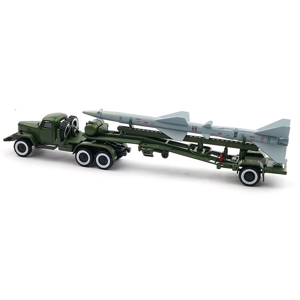 Immerse yourself in the detailed realism of this highly collectible die-cast model of the Hongqi 2 surface-to-air missile transport vehicle. Perfectly scaled at 1:64, it captures the vintage military design with an olive drab green finish and intricate details, from the rounded cab with horizontal grille slats to the realistically modeled black rubber tires on white rims. The flatbed is enriched with mechanical support elements, and the missile features fine surface markings, fins, and panel lines, all crafted with precision. Made from alloy, plastic, and rubber, this static display piece is intended for enthusiasts seeking authenticity and detailed craftsmanship. It’s an eye-catching addition to any collection, showcasing a blend of realism and military aesthetics.