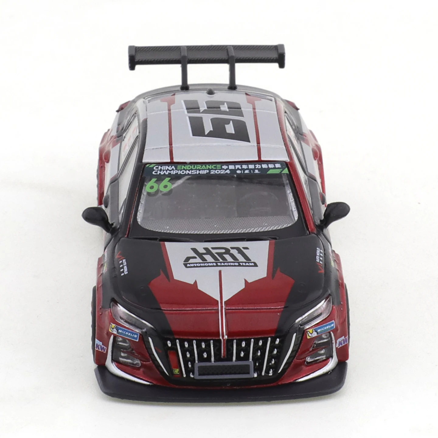 Immerse yourself in the thrill of racing with this meticulously crafted diecast model representing the Hongqi H6 Gr.2000T No.66-CEC 2024. Measuring approximately 1:64 scale, this model is a true collector's piece, showcasing sleek lines and detailed decals, including eye-catching green race numbers and sponsor logos. Its black body is accented by vivid red and white graphics, making it stand out on any display shelf. The front grille with vertical chrome-like slats, sculpted headlights, and air intake details mirror the real car’s aggressive styling. The clear windows reveal a realistic interior with seats and steering wheel, while the textured tires and red-accented black wheels complete the dynamic racing look. This model embodies sophistication, sportiness, and precision.
