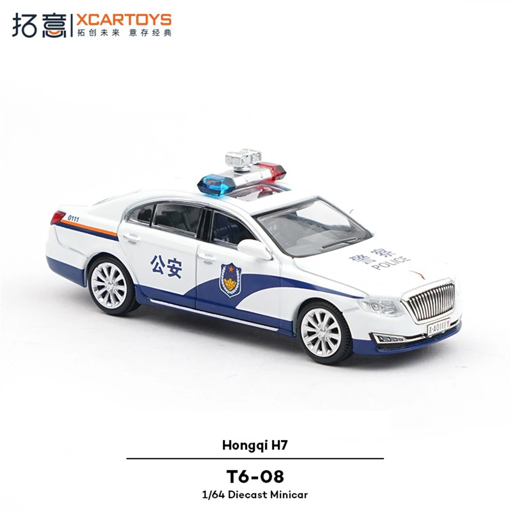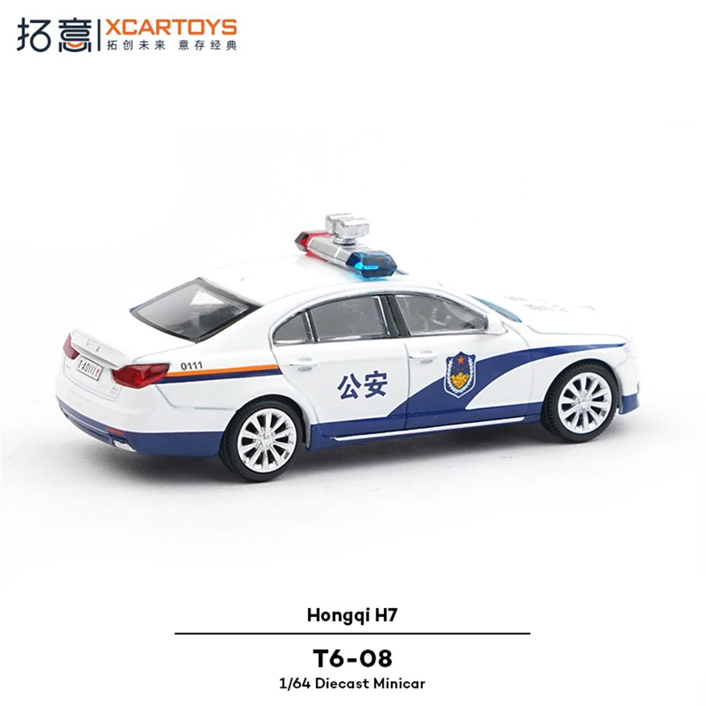 Imagine adding this impressive 1:64 scale diecast Hongqi H7 police sedan to your collection. Crafted with precise attention to detail, this diecast model features a sleek white exterior accented by vibrant blue and orange stripes along the sides, emphasizing its official police design. The front showcases a distinctive grille with vertical chrome slats, complemented by elongated headlights that subtly wrap around the body. The smooth, streamlined body includes flared rear wheel arches, white multi-spoke alloy wheels, and rubber tires, creating a realistic appearance. The roof-mounted light bar with flashing red and blue lights completes the authoritative look. Perfect for display and admiration, this collectible captures both modern style and authenticity.
