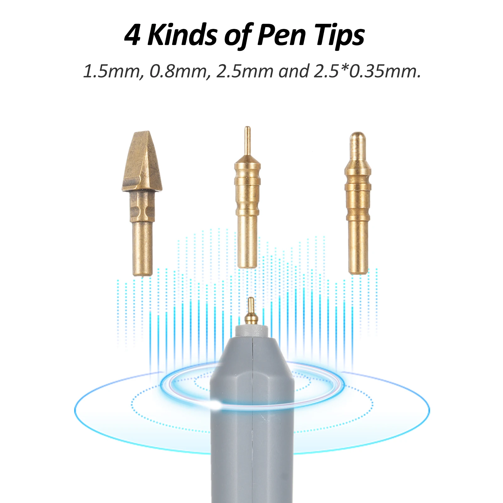 - Interchangeable tips include a broad flat chisel, a fine pointed tip, a rounded tip, and a narrow elongated tip, suitable for detailed, decorative, and broad stamping effects.