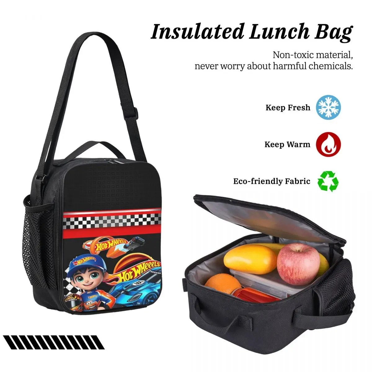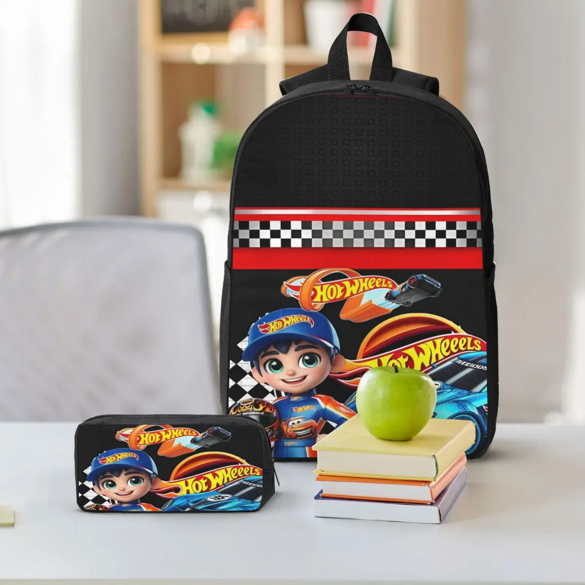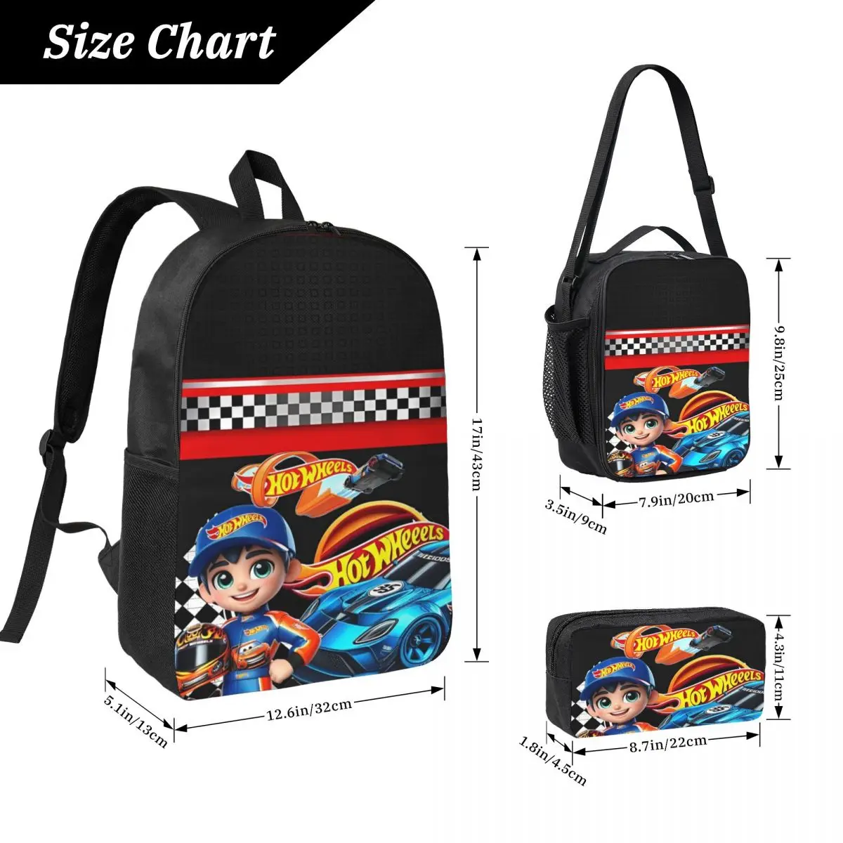 This vibrant 3-piece backpack set is perfect for young racing enthusiasts! The main backpack features a striking black background adorned with cartoon graphics showcasing a character in a blue cap alongside a blue car, making it perfect for school. Bold “Hot Wheels” text in lively orange and yellow adds a pop of color, while racing checkered patterns in red and white add an energetic vibe. The pencil case and lunch box echo this playful design, all made from durable Oxford fabric, ensuring long-lasting use. With ample storage, your child will love carrying their essentials in style!