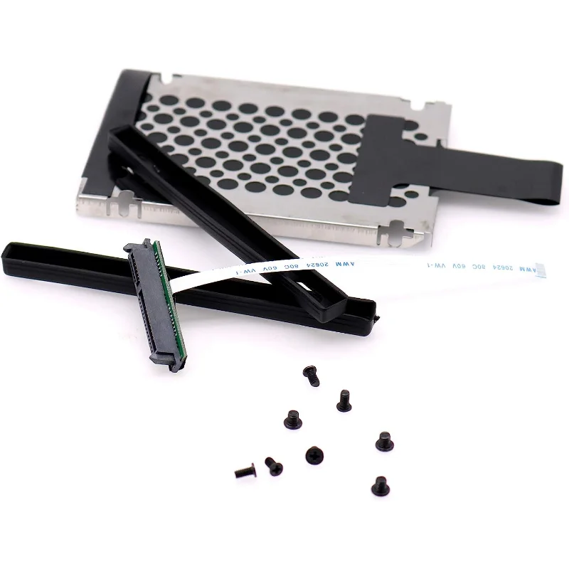 Enhance your HP 15s series laptop with this durable SATA hard drive caddy bracket kit, designed to securely hold and connect a 2.5-inch SATA HDD or SSD. The sleek, black rectangular frame features four precise circular cutouts for easy mounting, complemented by matte black plastic side rails and guide clips for a snug fit. Included are small screws for secure assembly and a flexible SATA cable (part numbers L52024-001 and L52025-001) for seamless data transfer. Compatible with models such as 15S-DU1004TX, 15S-DU1005TX, 15S-DU1008TX, and the 15s-GR series (15s-gr0003AU), offering a streamlined, high-tech solution for expanding or replacing your laptop’s storage capacity.