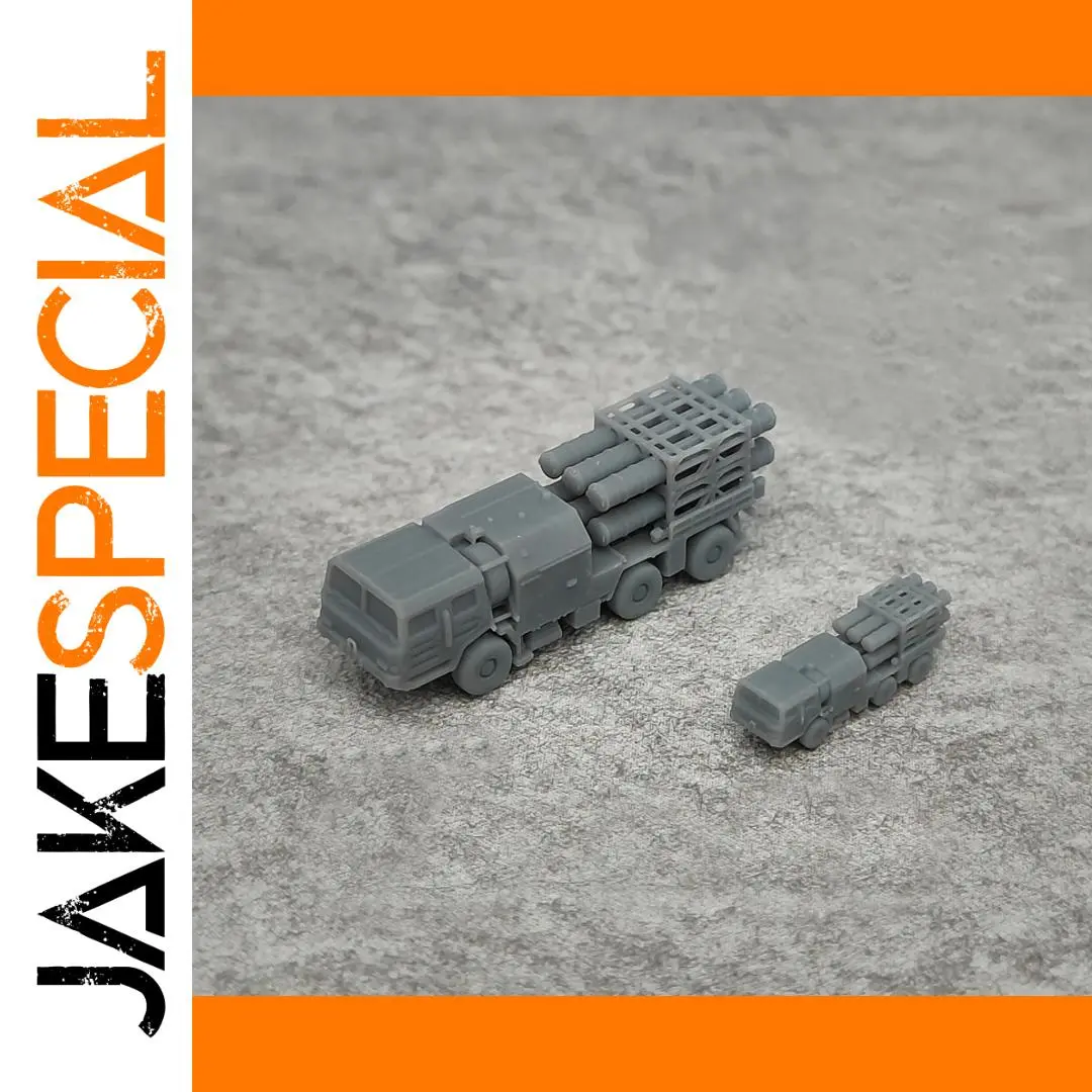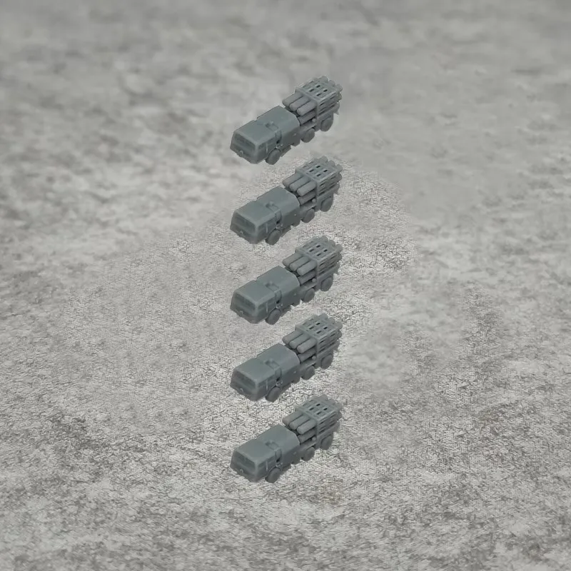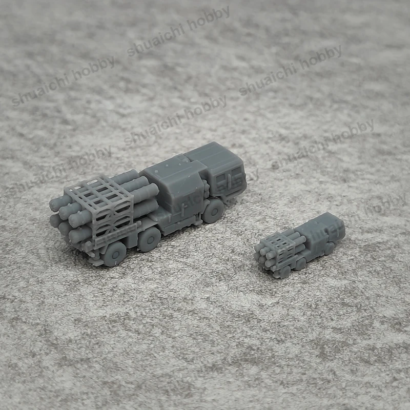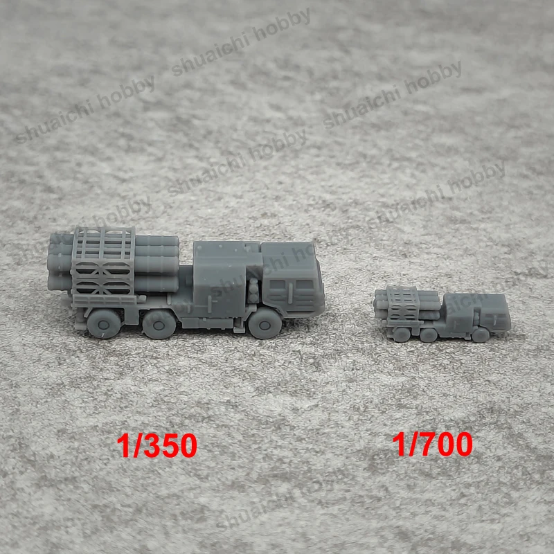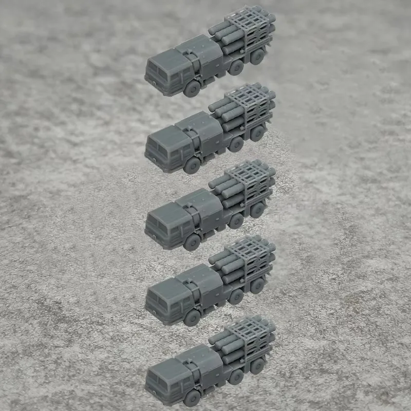 Experience the detailed craftsmanship of this resin model set, featuring five miniature HQ-16B medium-range air defense missile launchers. Perfect for hobbyists and collectors, these scaled models bring military realism to your display. Each piece showcases smooth, matte gray surfaces with sharply defined structural features like cab windows, headlights, and side panels. The cylindrical missile tubes are precisely arranged in parallel rows, extending slightly beyond the rear of the vehicle, reflecting authentic design. The models have seamless wheels, emphasizing mobility with a clean, polished finish. Whether you prefer the 1/700 scale at 1.42 cm length or the 1/350 scale at 2.84 cm, these models add a touch of realism and precision to your collection, ideal for display or dioramas.