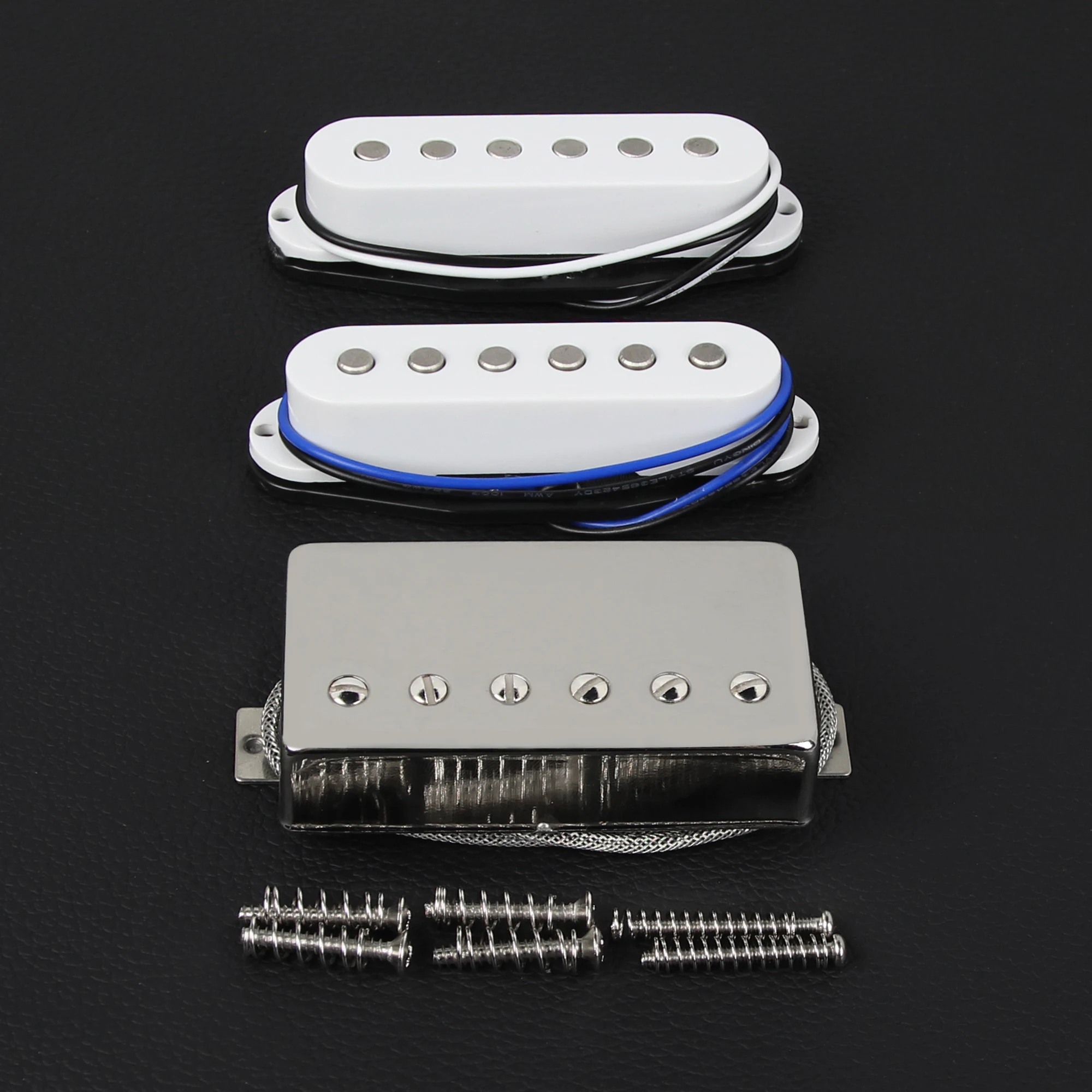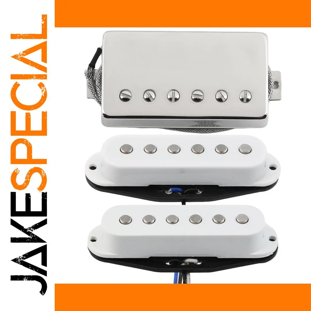 Step into your musical journey with this high-quality electric guitar pickup set designed for versatile HSS configurations. Crafted with precision, these pickups blend modern aesthetics with classic functionality. The set features a shiny chrome humbucker with adjustable screw poles, paired with two pristine white single-coil pickups, all fully waxed and sealed to ensure optimal sound quality and durability. Perfect for musicians seeking a balanced, vintage-inspired tone, this set allows you to achieve a rich, dynamic sound spectrum. Its sleek design with flat-top pole pieces and shielded wiring adds a stylish yet functional aesthetic, elevating your guitar's appearance and performance. Whether you're recording or performing live, this set transforms your instrument into a versatile powerhouse.