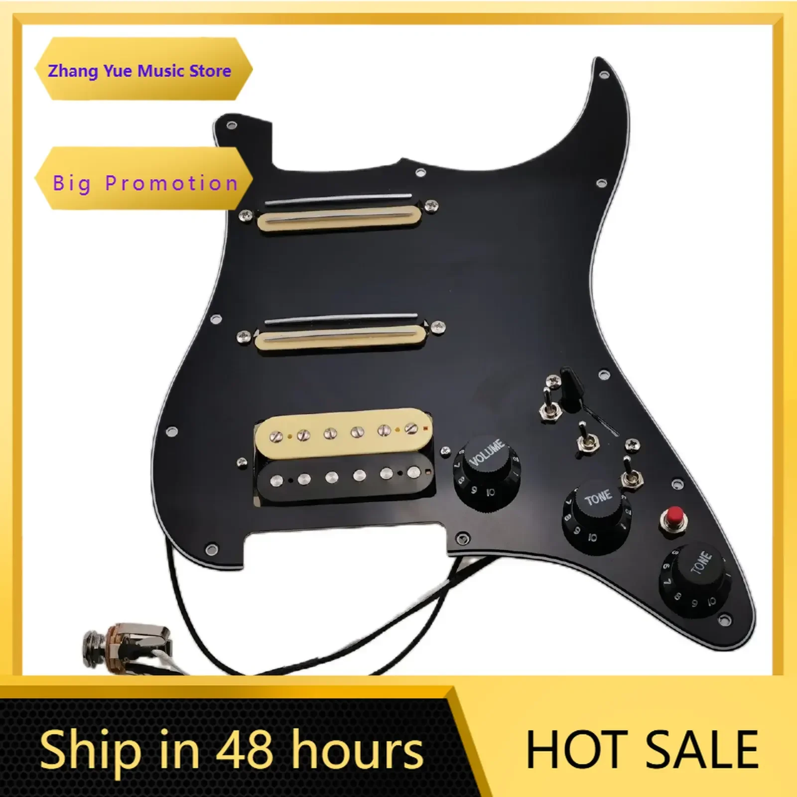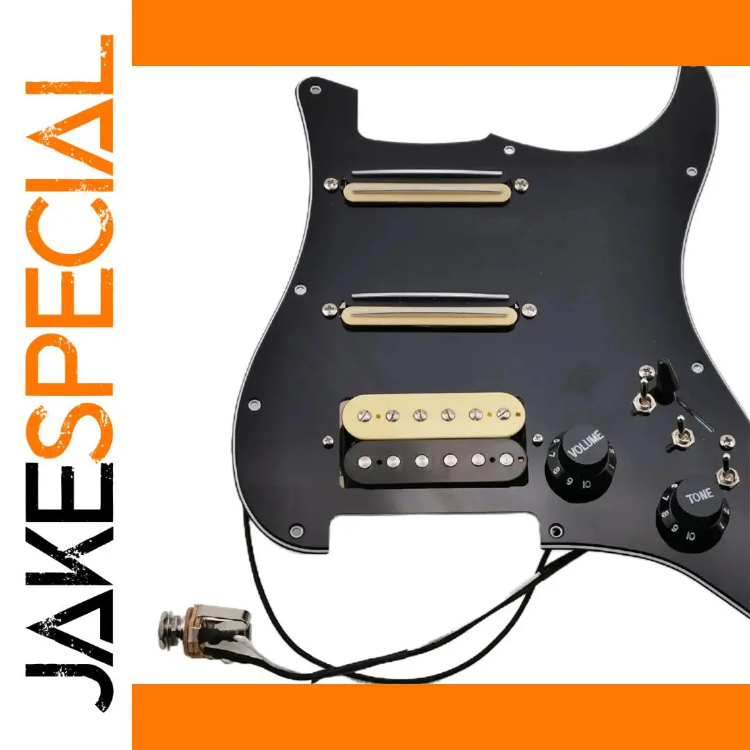 Experience the perfect blend of style, performance, and convenience with this this HSS prewired pickguard designed for electric guitars. Crafted for guitar enthusiasts, it offers a sleek black surface, complemented by three striking zebra-colored humbucker pickups with black covers edged in cream, creating a bold visual contrast. The pickguard features a classic Stratocaster-style layout, supporting versatile tonal settings. With dedicated control knobs, toggles, and multifunctional push-pull switches, you can easily customize your sound. Whether you're a professional musician or an avid hobbyist, this pickguard elevates your instrument’s aesthetic and functionality, making it a reliable upgrade for your guitar setup. Enjoy rich tones, quick installation, and an authentic look that combines high-quality craftsmanship with impressive performance.