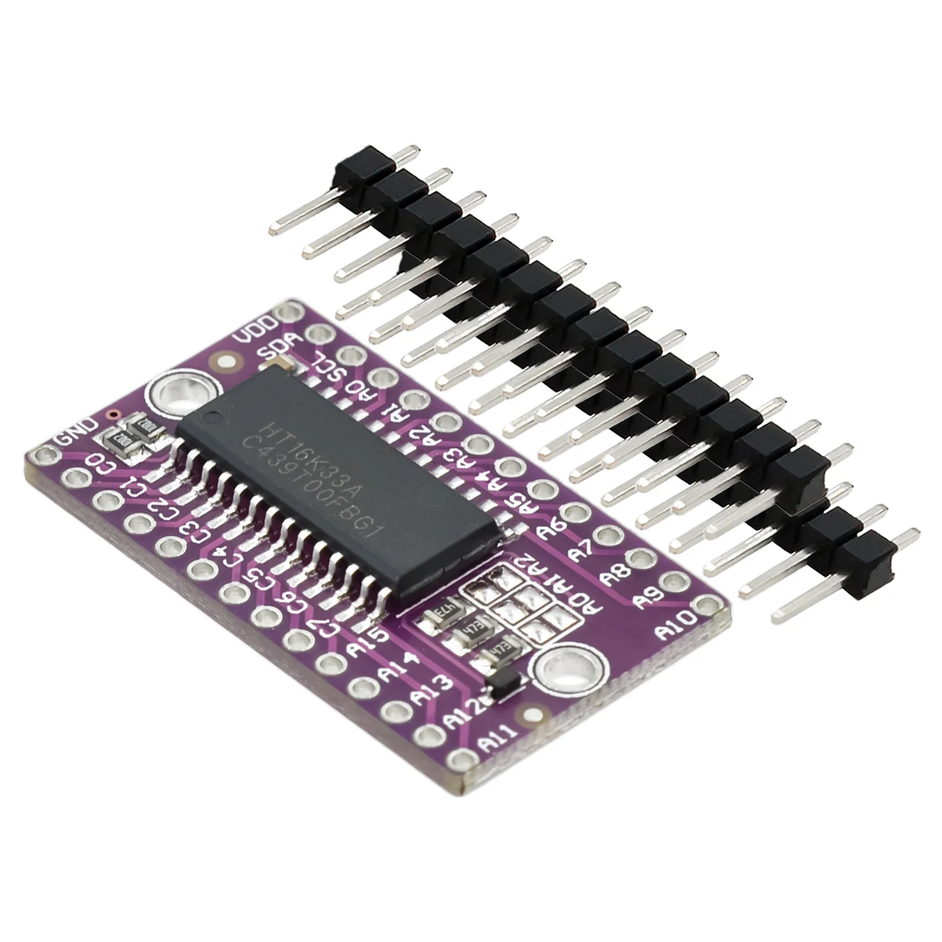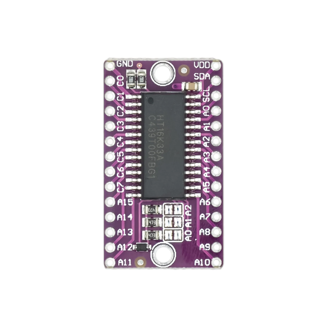 Experience the seamless integration of this HT16K33 LED Dot Matrix Drive Control Module into your electronic projects. Designed with a sleek, modern purple PCB, it offers a vibrant and professional aesthetic. The module features a compact layout, with silver solder pads and crisp white labels for easy identification of connection points like GND, VCC, SDA, SCL, and address settings A0, A1, A2. The black integrated circuit (IC) at the center provides a focal point of precision, with clearly printed white text. The 16 male header pins extend upward in a neat, organized line, making connections straightforward and reliable. This module is ideal for digital display applications, compatible with microcontrollers and digital systems, elevating your projects’ functionality and design.