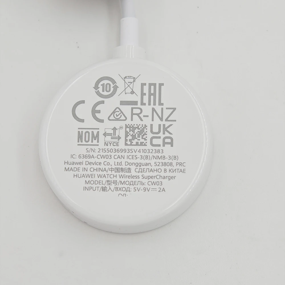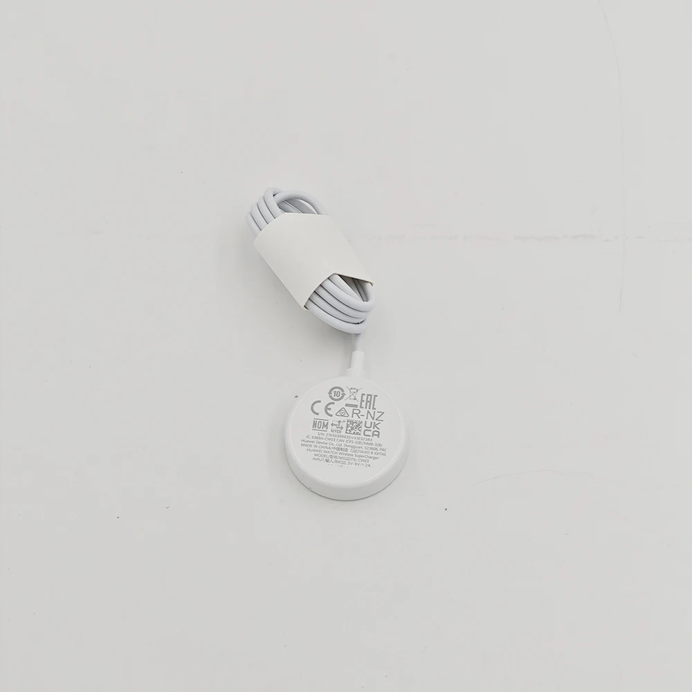 Experience seamless charging with this sleek, minimalist Huawei CW03 wireless charging dock. Made of durable metal with a smooth matte white finish, this circular dock combines simplicity with modern elegance. Its clean design features printed technical details and safety symbols that highlight its utilitarian yet refined style. The included flat, coiled white cable maintains a cohesive monochromatic aesthetic, emphasizing practicality and understated sophistication. Whether you're at home or in the office, this charging dock offers a clutter-free solution for keeping your Huawei Watch D, GT Runner, GT Cyber, Buds, 4, and 5 Pro always powered up. Its unobtrusive appearance complements contemporary decor while ensuring reliable, efficient charging every time you need it.