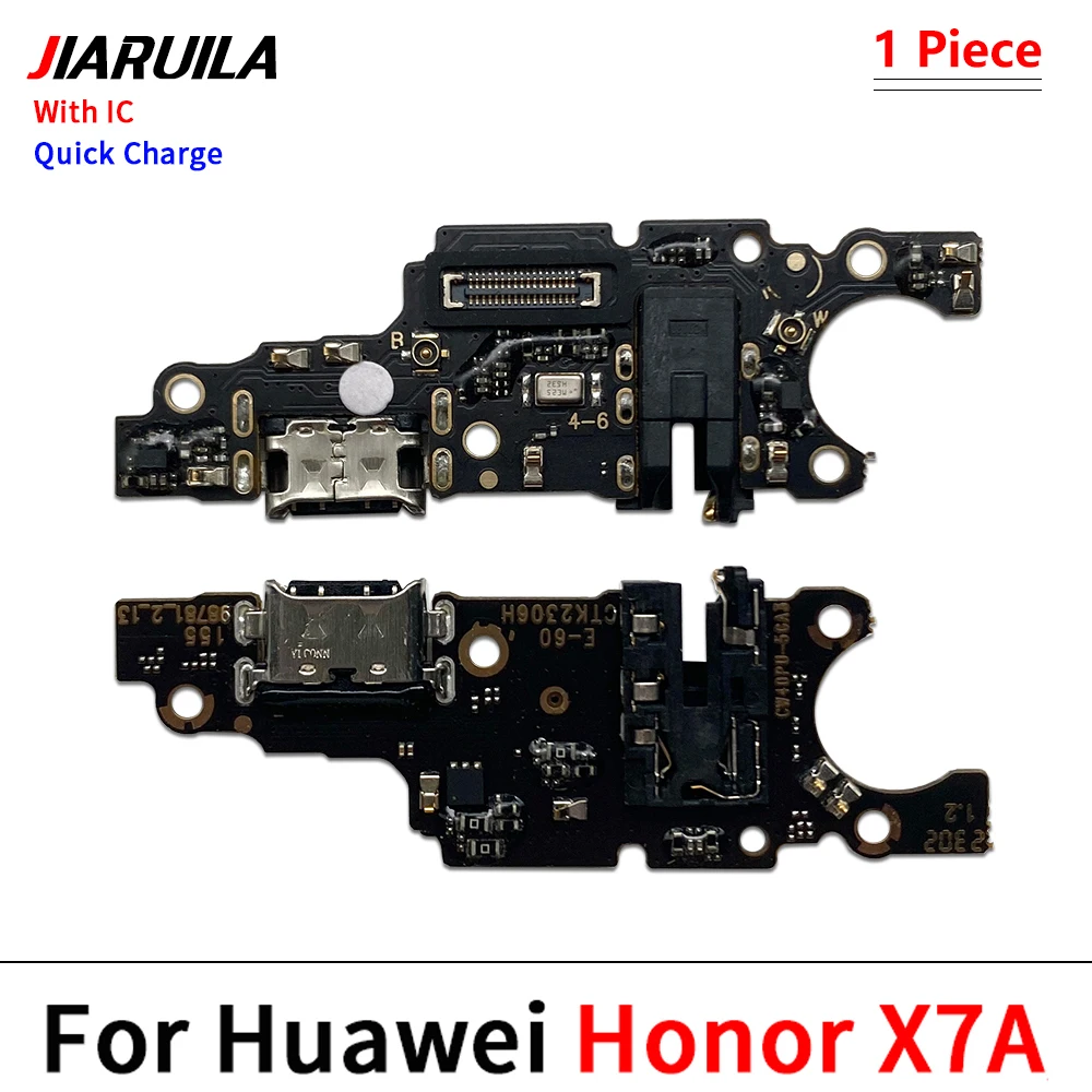 Enhance your Huawei Honor device with this durable USB charger dock connector, charging port, and microphone flex cable, compatible with models X6, X6A, X7, X7A, X7B, X8, X8A, X8B, X9A, and X9B supporting 4G and 5G networks. Crafted in a sleek bar shape, it features a vibrant green printed circuit board with clearly labeled components, including a metallic USB port, signal port, microphone, and connector to the mainboard flex. Each unit is rigorously tested for quality and safety, with no high-concerned chemicals involved. A reliable replacement to ensure your device functions seamlessly.